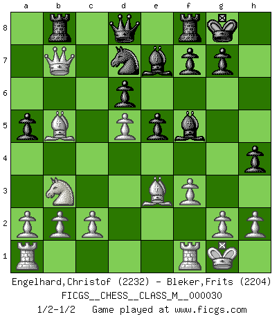 Last move : 1/2-1/2 2009 October 26 13:26:54 [Event "FICGS__CHESS__CLASS_M__000030"] [Site "FICGS"] [Date "2009.07.27"] [Round "1"] [White "Engelhard,Christof"] [Black "Bleker,Frits"] [Result "1/2-1/2"] [WhiteElo "2232"] [BlackElo "2204"] 1.e4 c5 2.Nf3 d6 3.Nc3 a6 4.d4 cxd4 5.Nxd4 Nf6 6.Be3 e5 7.Nb3 Be7 8.f3 Be6 9.Qd2 h5 10.Be2 Nbd7 11.Nd5 Nxd5 12.exd5 Bf5 13.O-O h4 14.Qb4 O-O 15.Qxb7 a5 16.Bb5 Rb8 17.Qc6 Rc8 18.Qa6 Ra8 19.Qb7 Rb8 20.Qc6 Rc8 21.Qb7 Rb8 1/2-1/2 Sicilian Kingside Castling by player White (move 13) Kingside Castling by player Black (move 14) This chess game ended in a draw. Follow this game move after move (download)The Chess pieces are the block alphabet which shapes thoughts; and these thoughts, although making a visual design on the chessboard, express their beauty abstractly, like a poem. (Marcel Duchamp) Privat ist Kortschnoi kein schlechter Mensch, sehr sympathisch. Aber während des Spiels ist er grausam. Er will dich töten. (Miguel Najdorf) No nos podemos resistir a la fascinación de un sacrificio ya que la pasión por los sacrificios es parte de la naturaleza de un jugador de Ajedrez. (Rudolf Spielman) Toutes les manuvres exécutées sur une colonne ouverte ont pour but ultime l'intrusion définitive sur la septième ou la huitième rangée, en plein cur de la position ennemie. (Aaron Nimzovitch) The Movers & Shakers of this world are those who play chess in the mornings and go to the disco in the evenings. (Dinesh De Silva)