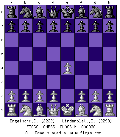 Last move : 1-0 2009 September 6 10:16:4 [Event "FICGS__CHESS__CLASS_M__000030"] [Site "FICGS"] [Date "2009.07.27"] [Round "1"] [White "Engelhard,Christof"] [Black "Lindenblatt,Ingo"] [Result "1-0"] [WhiteElo "2232"] [BlackElo "2293"] 1.e4 1-0 This chess game has been lost on time (started : 2009.07.27 18:33:39) King's pawn Opening Player White won this chess game. Follow this game move after move (download)Tactics flow from a superior position. (Bobby Fischer) Kasparov stellt für gewöhnlich die Regeln auf und bricht sie dann selbst wieder. (Alexej Shirov) La esencia del Ajedrez es pensar acerca de lo que el Ajedrez es. (David Bronstein) Botvinnik disait en comparant les échecs à la musique: Il existe une science dont le but est l'étude de l'acoustique et des sons. Mais il y a aussi un art qui se sert de l'océan des sons : c'est la musique. De toute évidence, il en est de même pour la pensée. La logique est l'étude des lois de la réflexion et les échecs reflètent, en tant qu'art, le côté logique de la réflexion, sous la forme d'images artistiques... Extrait de Fischer - Spassky, Reykjavik 1972 par Alexander & F. Wyndham (Ed. Solar), p 37. All maxims have their antagonist maxims; proverbs should be sold in pairs, a single one being but a half truth. (William Mathews)