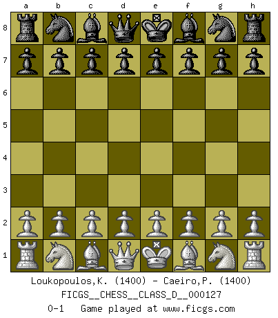 Last move : 0-1 2009 September 26 9:55:18 [Event "FICGS__CHESS__CLASS_D__000127"] [Site "FICGS"] [Date "2009.07.28"] [Round "1"] [White "Loukopoulos,Klearchos"] [Black "Caeiro,Pedro"] [Result "0-1"] [WhiteElo "1400"] [BlackElo "1400"] 0-1 Player Black won this chess game. Follow this game move after move (download)The stomach is an essential part of the Chess master. (Bent Larsen) Wenn Du absolut nicht mehr weißt, was Du tun sollst, dann ist es Zeit für Panik. (John van der Wiel) La enorme capacidad mental, en la que sin ella no puede un jugador de Ajedrez existir, es demasiado requerida por el Ajedrez al grado de que nunca podrá liberar su mente de este juego. (Albert Einstein) Des combinaisons [dans le jeu d'échecs] pareilles à des mélodies. Je crois entendre pour ainsi dire la musique des coups... (Vladimir Nabokov) Lamb in skin of tiger, still fears the wolf. (Chinese proverb)