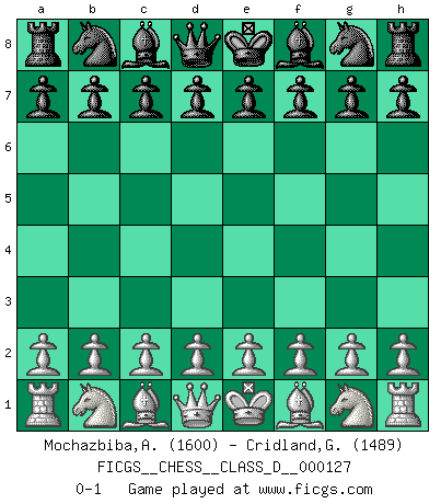 Last move : 0-1 2009 September 6 10:16:4 [Event "FICGS__CHESS__CLASS_D__000127"] [Site "FICGS"] [Date "2009.07.28"] [Round "1"] [White "Mochazbiba,Akiba"] [Black "Cridland,Graham"] [Result "0-1"] [WhiteElo "1600"] [BlackElo "1489"] 0-1 This chess game has been lost on time (started : 2009.07.28 0:51:3) Player Black won this chess game. Follow this game move after move (download)In life, as in Chess, one's own Pawns block one's way. A man's very wealth, ease, leisure, children, books, which should help him to win, more often checkmate him. (Charles Buxton) Ich würde mich als ganz normalen Jungen bezeichnen [Im Alter von 12]. (Sergej Karjakin) Cuando tengas duda... ¡juega al Ajedrez!. (Tevis) Tous ces prétendus hommes politiques sont les pions, les Cavaliers, les Tours ou les Fous d'une partie d'échecs qui se jouera tant qu'un hasard ne renversera pas l'échiquier. (Honoré de Balzac) He who defends everything defends nothing. (Frederick the Great)