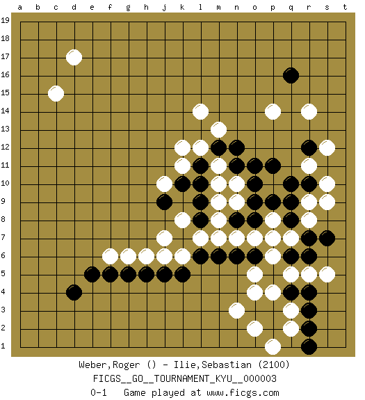 Last move : 0-1 2006 December 21 1:35:22 [Event "FICGS__GO__TOURNAMENT_KYU__000003"] [Site "FICGS"] [Date "2006.09.21"] [Round "1"] [Black "Weber,Roger"] [White "Ilie,Sebastian"] [Result "0-1"] [Rating 2 "2100"] 1.q16 d17 2.d4 q3 3.k10 c15 4.p3 p4 5.o3 o4 6.q4 n3 7.r3 q2 8.p2 q5 9.r4 o2 10.r2 p1 11.r1 r5 12.p5 q7 13.p7 p6 14.o6 o5 15.q8 o7 16.n6 p8 17.l9 r14 18.o8 n7 19.m6 m7 20.l6 l7 21.p9 p7 22.k7 k6 23.k5 j6 24.j5 h6 25.h5 g6 26.g5 f6 27.f5 k8 28.e5 n9 29.o9 n10 30.p11 p14 31.n11 m11 32.o11 m9 33.n8 m8 34.r7 r8 35.q9 r9 36.r6 s5 37.l10 m10 38.m12 l12 39.l11 m13 40.n12 l14 41.l8 k12 42.o10 j10 43.q6 j7 44.j9 k11 45.r10 s10 46.s7 r11 47.q10 s9 48.r12 s12 0-1 This go game has been lost on time (started : 2006.09.21 4:4:5) Here are the names of the openings (joseki) played in the four corners : Corner q4 : q3 p3 Komoku (Somok, Xiao~mu`) 3-4 Point. The komoku (3-4) point is the traditional corner enclosure move.. Corner q16 : q16 r14 Hoshi (Hwajeom, Seongjeom, Xingwei`) 4-4 Point. The star or hoshi (4-4) point, emphasizing influence at the potential expense of territory. Ikken Kakari (Hankan Keolch'im, Yi Gua`jiao~, 1-Space Low Approach). White 2 is the standard approach move to the 4-4. Corner d4 : d4 j6 Hoshi (Hwajeom, Seongjeom, Xingwei`) 4-4 Point. The star or hoshi (4-4) point, emphasizing influence at the potential expense of territory. Player White won this Go (weiqi, baduk) game. Follow this game move after move (download)The saki bottle shape is negative. (Anonymous) If computers get too powerful, we can organize them into committees. That'll do them in. (Anonymous)