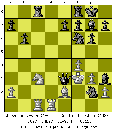 Last move : 0-1 2009 August 27 1:53:56 [Event "FICGS__CHESS__CLASS_D__000127"] [Site "FICGS"] [Date "2009.07.28"] [Round "1"] [White "Jorgenson,Evan"] [Black "Cridland,Graham"] [Result "0-1"] [WhiteElo "1800"] [BlackElo "1489"] 1.e4 c5 2.d3 d5 3.Nf3 dxe4 4.Ne5 Nd7 5.Nc4 Ngf6 6.Be2 Nb6 7.Nc3 Nxc4 8.O-O Nd6 9.f3 exd3 10.cxd3 g6 11.Be3 b6 12.d4 c4 13.Bf4 Bg7 14.b3 cxb3 15.Qxb3 O-O 16.Rac1 Be6 17.Qb4 Nf5 18.Ne4 Qxd4+ 19.Rf2 Qxb4 20.Nc3 Qxf4 21.R2f1 Ne3 22.Rfe1 Qg5 23.g3 Rac8 24.f4 Qc5 25.Kf2 Bh3 26.Kf3 Ng2 27.Red1 Qe3+ 0-1 Sicilian defense Kingside Castling by player White (move 8) Kingside Castling by player Black (move 15) Player Black won this chess game. Follow this game move after move (download)Nonsense was the last thing Fischer was interested in, as far as Chess was concerned. (Elie Agur) Oft bringt ein stiller Zug das Erdbeben. (Richard Reti) Botvinnik trató de alejar el misterio referente al Ajedrez, siempre relacionandolo a situaciones de la vida diaria. Solía llamar al Ajedrez un problema inexacto típico, similar a aquellos en que la gente tiene siempre que resolver a cada día. (Garry Kasparov) Un journaliste : 'Vous préférez avoir une dame de plus sur l'échiquier ou au lit ?' Boris Spassky : 'Ca dépend de la position.' My poor ole parrot... Is not in the circulation of displays ....poo hoo hoo :) (Wayne Lowrance's enigma)