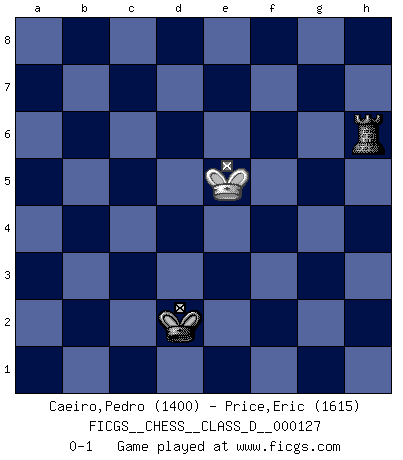 Last move : 0-1 2009 August 3 13:57:54 [Event "FICGS__CHESS__CLASS_D__000127"] [Site "FICGS"] [Date "2009.07.28"] [Round "1"] [White "Caeiro,Pedro"] [Black "Price,Eric"] [Result "0-1"] [WhiteElo "1400"] [BlackElo "1615"] 1.e4 e5 2.Nf3 Nc6 3.Bb5 a6 4.Ba4 Nf6 5.d3 Bc5 6.Bxc6 dxc6 7.O-O Qe7 8.Nc3 Bg4 9.a3 Rd8 10.Qe2 O-O 11.Be3 Rd7 12.Na4 Bd6 13.b4 b6 14.c4 c5 15.bxc5 Bxc5 16.Bxc5 bxc5 17.Qe3 Bxf3 18.Qxf3 Qd6 19.Rfd1 Qc6 20.Nc3 Rd4 21.Ra2 Rfd8 22.h3 Qb6 23.Nd5 Nxd5 24.exd5 Qb3 25.Qe2 f6 26.Qc2 Rb8 27.a4 Qxc2 28.Rxc2 a5 29.Rc3 Rb4 30.Ra1 Kf8 31.f3 Ke7 32.Kf2 Kd6 33.R1a3 c6 34.dxc6 Kxc6 35.Rc2 Rb1 36.Re2 Rd8 37.g3 Rdb8 38.Re1 R8b2+ 39.Re2 Rb4 40.Ke3 g5 41.f4 Rh1 42.fxg5 fxg5 43.Kf3 Kd6 44.Kg4 h6 45.h4 gxh4 46.gxh4 Ke6 47.Kh5 Rh3 48.Re4 Rb1 49.Kxh6 Rbh1 50.Kh5 Kf5 51.Rg4 Rd1 52.Rb3 R1xd3 53.Rb5 Rd4 54.Rxd4 cxd4 55.Rxa5 Rg3 56.Ra8 d3 57.c5 Rg7 58.Rf8+ Ke4 59.Rd8 Ke3 60.c6 Rc7 61.Rd6 d2 62.Kg5 Rxc6 63.Rxd2 Kxd2 64.Kf5 Rc4 65.h5 Rxa4 66.h6 Rh4 67.Kxe5 Rxh6 0-1 Ruy Lopez : Anderssen variation Kingside Castling by player White (move 7) Kingside Castling by player Black (move 10) 10 pieces endgame at move 54 : White KRPPP , Black KRPPP WHITE : King + 1 Rook 3 Pawns BLACK : King + 1 Rook 3 Pawns 9 pieces endgame at move 55 : White KRPPP , Black KRPP WHITE : King + 1 Rook 3 Pawns BLACK : King + 1 Rook 2 Pawns 8 pieces endgame at move 62 : White KRPP , Black KRPP WHITE : King + 1 Rook 2 Pawns BLACK : King + 1 Rook 2 Pawns 7 pieces endgame at move 63 : White KRPP , Black KRP WHITE : King + 1 Rook 2 Pawns BLACK : King + 1 Rook 1 Pawn 6 pieces endgame at move 63 : White KPP , Black KRP WHITE : King + 2 Pawns BLACK : King + 1 Rook 1 Pawn 5 pieces endgame at move 65 : White KP , Black KRP WHITE : King + 1 Pawn BLACK : King + 1 Rook 1 Pawn 4 pieces endgame at move 67 : White KP , Black KR WHITE : King + 1 Pawn BLACK : King + 1 Rook 3 pieces endgame at move 67 : White K , Black KR WHITE : King + BLACK : King + 1 Rook Player Black won this chess game. Follow this game move after move (download)Nowadays, when you're not a grandmaster at 14, you can forget about it. (Anand Viswanathan) Obwohl ich alt bin, darf mir niemand den Finger in den Mund stecken, sonst beisse ich. (Wilhelm Steinitz) En la perfecta combinación de Ajedrez como en una historia corta de primera clase, toda la trama y contra trama deberá conducir hacia un final sorprendente, el interes no es mitigado hasta el último momento. (Yates and Winter) Les Cavaliers se révèlent fort utiles dans les positions fermées. D'habitude, les Fous sont un peu plus forts que les Cavaliers dans les positions ouvertes. Qu'on le veuille ou non, il restera toujours des exceptions ! You lose, general Kenobi. (General Grievous in Star Wars ep.3)