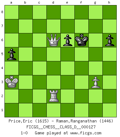 Last move : 1-0 2010 January 29 20:39:21 [Event "FICGS__CHESS__CLASS_D__000127"] [Site "FICGS"] [Date "2009.07.28"] [Round "1"] [White "Price,Eric"] [Black "Raman,Ranganathan"] [Result "1-0"] [WhiteElo "1615"] [BlackElo "1446"] 1.e4 e5 2.Nf3 Qf6 3.d4 Nc6 4.Bg5 Qd6 5.d5 Nce7 6.Nc3 a6 7.Bc4 h6 8.Be3 b5 9.Bb3 Ng6 10.a3 c5 11.Ne2 c4 12.Ba2 Bb7 13.b3 Qxa3 14.bxc4 Bb4+ 15.Bd2 Bxd2+ 16.Nxd2 Nf4 17.Nxf4 exf4 18.O-O Qc3 19.e5 Ne7 20.Rb1 O-O 21.Re1 Ng6 22.Nf3 Rae8 23.Rb3 Qxc4 24.e6 dxe6 25.dxe6 fxe6 26.Rb2 Qc6 27.Qd3 Rf6 28.Rd1 Ne5 29.Qe2 Nxf3+ 30.gxf3 Qxf3 31.Qxf3 Bxf3 32.Rd6 Rg6+ 33.Kf1 Bb7 34.c4 Kf8 35.cxb5 Ke7 36.Rd4 f3 37.Rbd2 Kf8 38.Rf4+ Ke7 39.b6 Rg2 40.Rh4 Rc8 41.Bb3 a5 42.Rc2 Ba6+ 43.Ke1 Rg1+ 44.Kd2 Rd8+ 45.Kc3 Rb1 46.Rb2 Rd3+ 47.Kc2 Rbd1 48.Bc4 Bxc4 49.Rxc4 R3d2+ 50.Kb3 Rxb2+ 51.Kxb2 Rd2+ 52.Ka3 Rxf2 53.b7 Rd2 54.b8Q f2 55.Rf4 g5 56.Qc7+ Rd7 57.Qc5+ Rd6 58.Rxf2 g4 59.Rd2 g3 60.Qxd6+ Kf6 61.hxg3 1-0 Greco defense Kingside Castling by player White (move 18) Kingside Castling by player Black (move 20) Promotion Queen by player White (move 54) 10 pieces endgame at move 58 : White KQRP , Black KRPPPP WHITE : King + 1 Queen 1 Rook 1 Pawn BLACK : King + 1 Rook 4 Pawns 9 pieces endgame at move 60 : White KQRP , Black KPPPP WHITE : King + 1 Queen 1 Rook 1 Pawn BLACK : King + 4 Pawns 8 pieces endgame at move 61 : White KQRP , Black KPPP WHITE : King + 1 Queen 1 Rook 1 Pawn BLACK : King + 3 Pawns Player White won this chess game. Follow this game move after move (download)In order to improve your game, you must study the endgame before everything else, for whereas the endings can be studied and mastered by themselves, the middle game and the opening must be studied in relation to the endgame. (Jose Raul Capablanca) Über Frauen: Chess is better. (Robert James Fischer) Bobby Fischer es el mas grande genio de Ajedrez de todos los tiempos. (Alexander Kotov) Je ne crois pas en la psychologie, je crois aux bons coups. (Robert Fischer) No, I am still playing. (Anatoly Karpov)