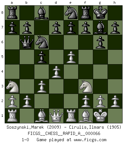 Last move : 1-0 2009 September 8 21:43:49 [Event "FICGS__CHESS__RAPID_A__000066"] [Site "FICGS"] [Date "2009.07.28"] [Round "1"] [White "Soszynski,Marek"] [Black "Cirulis,Ilmars"] [Result "1-0"] [WhiteElo "2009"] [BlackElo "1905"] 1.e4 c5 2.Nf3 Nc6 3.Bb5 g6 4.O-O Bg7 5.c3 Qb6 6.Na3 Nf6 7.e5 Nd5 8.Bc4 Nc7 9.Re1 O-O 10.Bf1 Ne8 11.d4 1-0 This chess game has been lost on time (started : 2009.07.28 6:9:24) Sicilian : Nimzovich-Rossolimo attack (with ...g6, without ...d6) Kingside Castling by player White (move 4) Kingside Castling by player Black (move 9) Player White won this chess game. Follow this game move after move (download)After a bad opening, there is hope for the middle game. After a bad middle game, there is hope for the endgame. But once you are in the endgame, the moment of truth has arrived. (Edmar Mednis) Schach ist Kampf, hauptsächlich jedoch gegen die eigenen Fehler. (Savielly Grigorievitsch Tartakower) Es el objetivo de la escuela moderna no tratar cada posición de acuerdo a una regla general, sino de acuerdo al principio inherente en la posición. (Richard Reti) Soyez une menace à chaque fois que vous vous asseyez pour jouer. (Ken Smith) Every man's memory is his private literature. (Aldous Huxley)