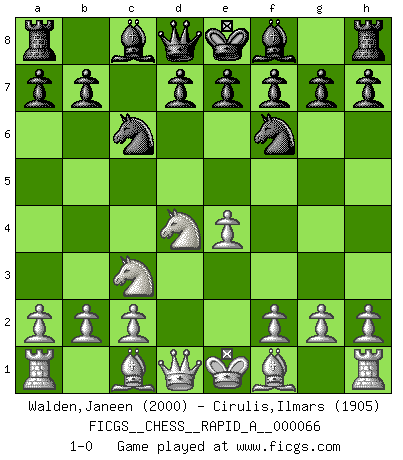 Last move : 1-0 2009 September 1 9:48:46 [Event "FICGS__CHESS__RAPID_A__000066"] [Site "FICGS"] [Date "2009.07.28"] [Round "1"] [White "Walden,Janeen"] [Black "Cirulis,Ilmars"] [Result "1-0"] [WhiteElo "2000"] [BlackElo "1905"] 1.e4 c5 2.Nf3 Nc6 3.d4 cxd4 4.Nxd4 Nf6 5.Nc3 1-0 This chess game has been lost on time (started : 2009.07.28 6:9:24) Sicilian defense Player White won this chess game. Follow this game move after move (download)Fischer wanted to give the Russians a taste of their own medicine. (Larry Evans) Wenn du gegen Bobby spielst, ist es keine Frage von gewinnen oder verlieren. Es ist eine Frage des Überlebens. (Boris Vassilievich Spassky) Nos gusta pensar. (Gary Kasparov) Tous ces prétendus hommes politiques sont les pions, les Cavaliers, les Tours ou les Fous d'une partie d'échecs qui se jouera tant qu'un hasard ne renversera pas l'échiquier. (Honoré de Balzac) Luck is the residue of design. (John Milton)