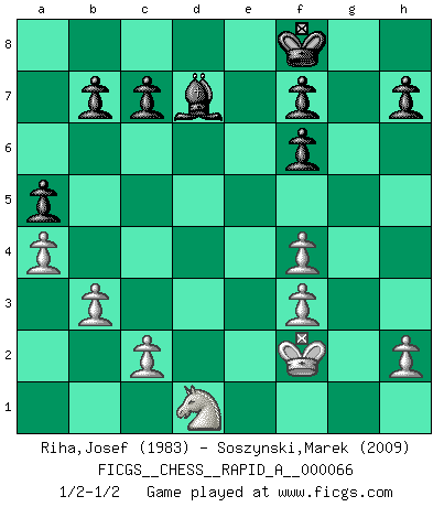 Last move : 1/2-1/2 2009 July 30 13:34:43 [Event "FICGS__CHESS__RAPID_A__000066"] [Site "FICGS"] [Date "2009.07.28"] [Round "1"] [White "Riha,Josef"] [Black "Soszynski,Marek"] [Result "1/2-1/2"] [WhiteElo "1983"] [BlackElo "2009"] 1.e4 e5 2.Nf3 Nc6 3.Bb5 Nf6 4.O-O Nxe4 5.d4 Nd6 6.dxe5 Nxb5 7.a4 Nbd4 8.Nxd4 Nxd4 9.Qxd4 d5 10.exd6 Qxd6 11.Qe4+ Qe6 12.Qd4 Qd6 13.Qe3+ Be6 14.Nc3 a6 15.Qf3 Qb4 16.Rd1 Be7 17.b3 Bf6 18.Bb2 O-O 19.Na2 Qg4 20.Bxf6 Qxf3 21.gxf3 gxf6 22.Nc3 Kg7 23.Nd5 Rad8 24.Ne3 Bh3 25.f4 Rfe8 26.Rxd8 Rxd8 27.Rd1 Rxd1+ 28.Nxd1 a5 29.f3 Kf8 30.Kf2 Bd7 1/2-1/2 Ruy Lopez : Open Berlin defense, l'Hermet variation Kingside Castling by player White (move 4) Kingside Castling by player Black (move 18) This chess game ended in a draw. Follow this game move after move (download)Good offense and good defense both begin with good development. (Bruce A. Moon) Herr Iljumschinow ist ein etwas merkwürdiger Geschäftsmann: Er arbeitet zusammen mit Leuten wie Muammar al-Gaddafi; früher ist das Saddam Hussein gewesen. (Joel Lautier) Tu no necesitas jugar muy bien, únicamente ayudar a tu oponenet a que juegue muy mal. (Genrikh Chepukaitis) Une platitude souvent récitée à propos des Echecs est qu'une des choses les plus difficiles à réaliser est de gagner une position gagnante. Cela ne manque pas de sens mais, pour ma part, j'ai toujours trouvé plus difficile de gagner une position perdante. (Tim Krabbe) Now be brave and don't look back. Don't look back. (Shmi Skywalker in Star Wars ep.1)