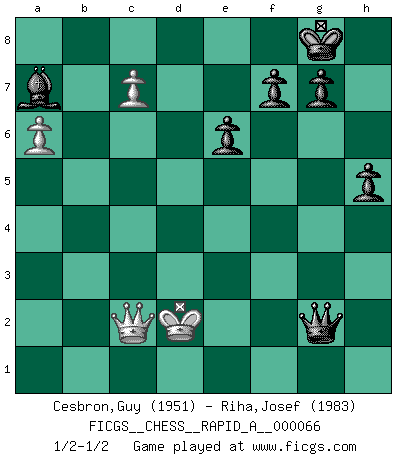 Last move : 1/2-1/2 2009 October 29 23:57:49 [Event "FICGS__CHESS__RAPID_A__000066"] [Site "FICGS"] [Date "2009.07.28"] [Round "1"] [White "Cesbron,Guy"] [Black "Riha,Josef"] [Result "1/2-1/2"] [WhiteElo "1951"] [BlackElo "1983"] 1.e4 d5 2.exd5 Qxd5 3.Nc3 Qd6 4.d4 Nf6 5.Nf3 a6 6.g3 b5 7.Bg2 Bb7 8.O-O e6 9.Bf4 Qb6 10.a4 Bd6 11.Be3 b4 12.a5 Qa7 13.Na4 Nd5 14.c4 bxc3 15.bxc3 Nd7 16.c4 Nxe3 17.fxe3 Be7 18.c5 Rb8 19.Rb1 Bc6 20.Nc3 Rxb1 21.Qxb1 Qa8 22.Qa2 O-O 23.Qd2 Rb8 24.e4 h6 25.Qf4 Qb7 26.h3 Qc8 27.Kh2 Ba8 28.Ne1 Qe8 29.Qxc7 Rb3 30.Ne2 Nf6 31.Qa7 Nxe4 32.Nf3 Rb2 33.Qxa6 Qb8 34.Qd3 Rxe2 35.Qxe2 Nxg3 36.Qe5 Nxf1+ 37.Bxf1 Qb4 38.Bg2 Bxf3 39.Bxf3 Bf6 40.Qe4 Qd2+ 41.Be2 Bxd4 42.c6 Ba7 43.a6 Qe1 44.h4 Bb8+ 45.Kg2 Qg3+ 46.Kf1 Ba7 47.Qg2 Qxh4 48.Bf3 h5 49.Qc2 Qd4 50.c7 Qg1+ 51.Ke2 Qe3+ 52.Kd1 Qxf3+ 53.Kd2 Qe3+ 54.Kd1 Qg1+ 55.Kd2 Qg2+ 1/2-1/2 Scandinavian : Pytel-Wade variation Kingside Castling by player White (move 8) Kingside Castling by player Black (move 22) This chess game ended in a draw. Follow this game move after move (download)You know, comrade Pachman, I don't enjoy being a Minister, I would rather play Chess like you. (Che Guevara) Als er Schachweltmeister wurde ließ er praktisch alle stärksten Sovietspieler für sich arbeiten. Wenn ein auch nur mittelmässiger Meister ein Spezialist für eine bestimmte Eröffnung war, wurde er von Karpov gerufen. Das wurde alles geheim gehalten. (Mikhail Moiseyevich Botvinik) Me siento como si fuera una pieza en una partida de Ajedrez, cuando mi oponente me indica: esa pieza no puede ser movida. (Soren Kierkegaard) Le moment que je préfère le plus dans une rencontre, c'est celui où je sens que la personnalité de l'adversaire se brise. (Robert Fischer) Whoever said the pen is mightier than the sword obviously never encountered automatic weapons. (US General Douglas MacArthur)