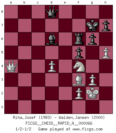 Last move : 1/2-1/2 2009 September 28 20:9:36 [Event "FICGS__CHESS__RAPID_A__000066"] [Site "FICGS"] [Date "2009.07.28"] [Round "1"] [White "Riha,Josef"] [Black "Walden,Janeen"] [Result "1/2-1/2"] [WhiteElo "1983"] [BlackElo "2000"] 1.g3 e5 2.c4 Nf6 3.Bg2 d5 4.cxd5 Nxd5 5.Nf3 Nc6 6.Nc3 Nb6 7.O-O Be7 8.Rb1 a5 9.d3 O-O 10.Be3 Bg4 11.Rc1 a4 12.a3 Be6 13.Bxb6 cxb6 14.e3 b5 15.h4 f6 16.d4 Bb3 17.Qd2 Qb6 18.Qd3 Bc4 19.Qf5 g6 20.Qb1 exd4 21.Nxd4 Nxd4 22.exd4 Bxf1 23.Nd5 Qd8 24.Rxf1 Bd6 25.Qd3 Qa5 26.h5 Kg7 27.Bf3 f5 28.Kg2 b4 29.Rh1 bxa3 30.bxa3 Rae8 31.Rb1 Rf7 32.Rb6 Rd7 33.Qb1 Bxa3 34.Rxb7 Qd8 35.Qb5 Rxb7 36.Qxb7+ Re7 37.Qa6 Rf7 38.Nf4 Rf6 39.Qxa4 Bd6 1/2-1/2 Benko's Opening Kingside Castling by player White (move 7) Kingside Castling by player Black (move 9) This chess game ended in a draw. Follow this game move after move (download)If a ruler does not understand Chess, how can he rule over a kingdom ? (King Khusros II) Stelle das Brett so, daß die Sonne in die Augen deines Gegners scheint. (Ruy López) Todavía soy una víctima del Ajedrez. Tiene toda la belleza del arte y mucho mas. No puede ser comercializado. El Ajedrez es mas puro que el arte en su posición social. (Marcel Duchamp) D'abord les bases : Jouez et étudiez, puis étudiez et jouez, ensuite jouez et étudiez, puis étudiez et jouez. Deuxièmement : Donnez toujours le meilleur de vous-même ! (Ken Smith) Computers are like Old Testament gods; lots of rules and no mercy. (Joseph Campbell)