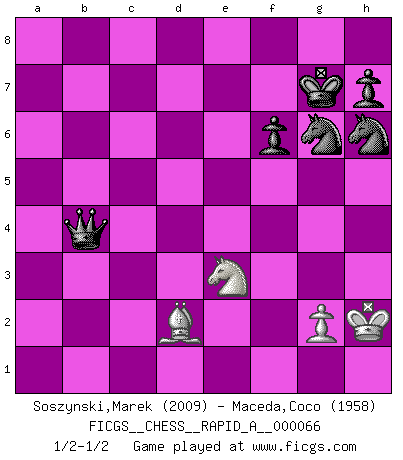 Last move : 1/2-1/2 2009 October 6 9:36:13 [Event "FICGS__CHESS__RAPID_A__000066"] [Site "FICGS"] [Date "2009.07.28"] [Round "1"] [White "Soszynski,Marek"] [Black "Maceda,Coco"] [Result "1/2-1/2"] [WhiteElo "2009"] [BlackElo "1958"] 1.e4 c5 2.Nf3 d6 3.Bb5+ Bd7 4.Bxd7+ Qxd7 5.c4 Nc6 6.Nc3 g6 7.d4 cxd4 8.Nxd4 Bg7 9.Nde2 Nf6 10.f3 a6 11.O-O Ne5 12.b3 b5 13.cxb5 axb5 14.Be3 O-O 15.Nf4 Qb7 16.Rc1 Rfc8 17.Qd2 Bh6 18.Kh1 Bxf4 19.Bxf4 b4 20.Na4 Nfd7 21.Rfd1 f6 22.Be3 g5 23.Qe2 Rxc1 24.Rxc1 Rc8 25.Kg1 Rxc1+ 26.Bxc1 Kg7 27.Bd2 Nf8 28.h4 gxh4 29.f4 Nf7 30.Qc4 Qd7 31.Qe2 Qa7+ 32.Qf2 Qb7 33.Qd4 Qc8 34.Nb6 Qc2 35.Nd5 Qb1+ 36.Kh2 Nh6 37.Ne3 Qxa2 38.e5 dxe5 39.fxe5 Qxb3 40.exf6+ exf6 41.Qxh4 Ng6 42.Qxb4 Qxb4 1/2-1/2 Sicilian : Canal-Sokolsky attack, Sokolsky variation Kingside Castling by player White (move 11) Kingside Castling by player Black (move 14) 10 pieces endgame at move 42 : White KBNP , Black KQNNPP WHITE : King + 1 Bishop 1 Knight 1 Pawn BLACK : King + 1 Queen 2 Knights 2 Pawns This chess game ended in a draw. Follow this game move after move (download)Castle early and often. (Rob Sillars) Frage: Gibt es etwas was Sie mehr lieben als Autobahnen ohne Tempobegrenzungen? - Antwort: Deutsche Frauen ohne Tempobegrenzungen. (Loek van Wely) Las leyes del Ajedrez no permiten una libre elección: tienes que mover quieras o no. (Emanuel Lasker) Les Echecs sont affaire de jugement sensible. Savoir quand frapper et quand esquiver. (Fischer) 'preceded by its own quotation yields a falsehood' preceded by its own quotation yields a falsehood. (W. V. O. Quine - Set Theory And Its Logic, 1953)