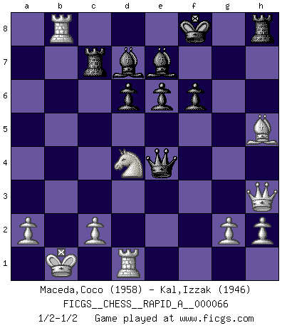 Last move : 1/2-1/2 2009 October 6 23:16:21 [Event "FICGS__CHESS__RAPID_A__000066"] [Site "FICGS"] [Date "2009.07.28"] [Round "1"] [White "Maceda,Coco"] [Black "Kal,Izzak"] [Result "1/2-1/2"] [WhiteElo "1958"] [BlackElo "1946"] 1.e4 c5 2.Nf3 Nc6 3.d4 cxd4 4.Nxd4 Nf6 5.Nc3 d6 6.Bg5 e6 7.Qd2 a6 8.O-O-O Bd7 9.f4 b5 10.Bxf6 gxf6 11.Kb1 b4 12.Nce2 Qb6 13.Qd3 Rc8 14.Nxc6 Qxc6 15.Nd4 Qc5 16.Be2 a5 17.Nb3 Qc7 18.f5 a4 19.Nd4 Qc5 20.fxe6 fxe6 21.Rhf1 Be7 22.Bg4 Kf7 23.Qh3 Qe5 24.Nf3 Qc5 25.Bh5+ Kf8 26.Nd4 Qe5 27.Rf3 Rc5 28.Bg4 Kf7 29.Rg3 a3 30.bxa3 bxa3 31.Rxa3 h5 32.Be2 Rc7 33.Rb3 Qxe4 34.Bxh5+ Kf8 35.Rb8+ 1/2-1/2 Sicilian defense Queenside Castling by player White (move 8) This chess game ended in a draw. Follow this game move after move (download)Up to this point White has been following well-known analysis. But now he makes a fatal error: he begins to use his own head. (Siegbert Tarrasch) Ich würde mich als ganz normalen Jungen bezeichnen [Im Alter von 12]. (Sergej Karjakin) El Ajedrez es un regaderazo frío para la mente. (Sir John Simon) Les Cavaliers se révèlent fort utiles dans les positions fermées. D'habitude, les Fous sont un peu plus forts que les Cavaliers dans les positions ouvertes. Qu'on le veuille ou non, il restera toujours des exceptions ! Beep ! (R2D2 in Star Wars ep.3)