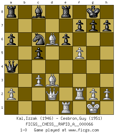 Last move : 1-0 2009 September 15 13:7:32 [Event "FICGS__CHESS__RAPID_A__000066"] [Site "FICGS"] [Date "2009.07.28"] [Round "1"] [White "Kal,Izzak"] [Black "Cesbron,Guy"] [Result "1-0"] [WhiteElo "1946"] [BlackElo "1951"] 1.e4 c5 2.Nf3 Nc6 3.d4 cxd4 4.Nxd4 d5 5.exd5 Qxd5 6.Be3 e6 7.Nc3 Bb4 8.Qd2 Qa5 9.Nb3 Qe5 10.f4 Qf6 11.Bc5 Bxc3 12.bxc3 Nge7 13.Bb5 O-O 14.Rd1 Re8 15.O-O a6 16.Bd3 Nd5 17.c4 Nc3 18.Rde1 Na4 19.Bd6 b6 20.c5 Nxc5 21.Nxc5 Qd4+ 22.Rf2 bxc5 23.c3 Qa4 24.f5 1-0 Sicilian : Nimzovich variation Kingside Castling by player Black (move 13) Kingside Castling by player White (move 15) Player White won this chess game. Follow this game move after move (download)No Chess Grandmaster is normal; they only differ in the extent of their madness. (Viktor Korchnoi) Sie bekommen vielleicht den Eindruck, dass die Spitzenspieler überhaupt gar nicht so stark sind. Aber das stimmt nicht. Es ist eine Illusion. Mit einem Computer an der Seite ist es sehr leicht, Urteile zu fällen, aber wenn man alleine am Brett sitzt, sieht die Sache ganz anders aus. (Vladimir Kramnik) El juego del Ajedrez no es solamente una diversión quieta; algunas cualidades muy valuables de la mente se pueden adquirir y cultivar con el, como convertirlos en habitos disponibles para toda ocasión; ya que la vida es algo así como el Ajedrez. (Benjamin Franklin) La vérité est comme le meilleur coup aux échecs : elle existe, mais il faut la chercher. (Arturo Perez-Reverte) Strategy without tactics is the slowest route to victory. Tactics without strategy is the noise before defeat. (Sun Tzu)