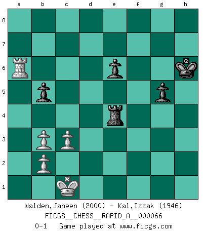 Last move : 0-1 2009 November 16 10:15:7 [Event "FICGS__CHESS__RAPID_A__000066"] [Site "FICGS"] [Date "2009.07.28"] [Round "1"] [White "Walden,Janeen"] [Black "Kal,Izzak"] [Result "0-1"] [WhiteElo "2000"] [BlackElo "1946"] 1.e4 c5 2.Nf3 d6 3.d4 cxd4 4.Nxd4 Nf6 5.Nc3 Nc6 6.Bg5 e6 7.Qd2 a6 8.O-O-O Bd7 9.f3 h6 10.Be3 b5 11.Nxc6 Bxc6 12.Kb1 Qc7 13.Ne2 Bb7 14.h4 Rd8 15.Bd4 Rc8 16.Nc1 Be7 17.Nd3 h5 18.Be2 O-O 19.Bc3 Rfe8 20.Ba5 Qc6 21.Rh3 Nd7 22.c3 Nb6 23.Rg3 Kh7 24.Qf4 Rf8 25.e5 Nd5 26.Qd2 g6 27.f4 Qc4 28.Bb4 Rfd8 29.exd6 Bxd6 30.Nc5 Qxf4 31.Qxf4 Bxf4 32.Rf3 Ba8 33.Rxd5 Rxd5 34.Rxf4 Rdxc5 35.Bxc5 Rxc5 36.Rxf7+ Kh6 37.g4 hxg4 38.Bxg4 Be4+ 39.Kc1 Bd5 40.Ra7 Rc4 41.Bd1 Rxh4 42.Rxa6 g5 43.Bb3 Bxb3 44.axb3 Re4 0-1 Sicilian : Richter-Rauzer, Rauzer attack, 7...a6 Queenside Castling by player White (move 8) Kingside Castling by player Black (move 18) 10 pieces endgame at move 44 : White KRPPP , Black KRPPP WHITE : King + 1 Rook 3 Pawns BLACK : King + 1 Rook 3 Pawns Player Black won this chess game. Follow this game move after move (download)When I asked Fischer why he had not played a certain move in our game, he replied: 'Well, you laughed when I wrote it down !' (Mikhail Tal) Korrekt heißt in Deutschland die Haltung eines Mannes, dessen Benehmen nach dem Urteile seiner Nachbarn seiner Stellung angemessen ist. Um korrekt zu sein, muß man sich der Meinung der anderen anpassen... (Emanuel Lasker) Cuando no sepas que mover, espera por una idea que se le venga a la la cabeza de tu oponente. Tenlo por seguro de que esa idea estará incorrecta. (Siegbert Tarrasch) La menace est plus forte que l'exécution. (Aaron Nimzovitch) Humor is by far the most significant activity of the human brain. (Edward De Bono)