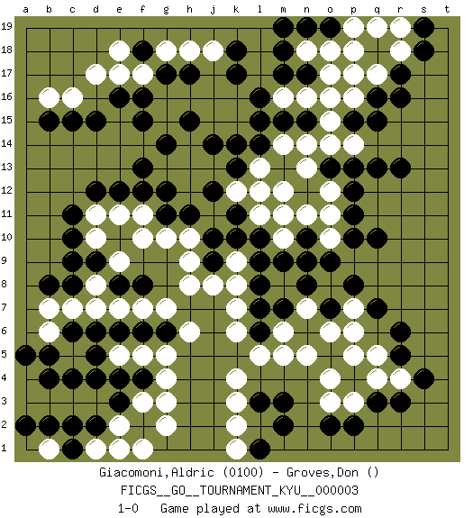Last move : 1-0 2007 February 2 4:39:25 [Event "FICGS__GO__TOURNAMENT_KYU__000003"] [Site "FICGS"] [Date "2006.09.21"] [Round "1"] [Black "Giacomoni,Aldric"] [White "Groves,Don"] [Result "1-0"] [Rating 1 "0100"] 1.q16 q4 2.d4 d17 3.c15 c16 4.d15 b16 5.f16 f17 6.e16 e17 7.q10 k4 8.r6 o4 9.k17 f3 10.c6 d10 11.d12 d8 12.d9 e9 13.c9 e7 14.c8 e5 15.k10 h10 16.r3 r4 17.q3 p3 18.s4 p5 19.r5 q5 20.p2 o3 21.o2 m5 22.f12 f10 23.n8 h12 24.g14 k12 25.k14 k9 26.l9 j8 27.l8 k7 28.l7 k6 29.m2 k2 30.l12 j11 31.k11 c5 32.c4 d3 33.d5 c3 34.e4 c7 35.b5 b7 36.c10 b3 37.e3 e2 38.f4 g3 39.e6 f5 40.r17 d7 41.f6 g5 42.r13 p7 43.p8 n7 44.q7 o6 45.m7 o8 46.o9 j13 47.j14 g13 48.f13 h14 49.h15 e11 50.e12 d11 51.c11 f11 52.g12 h13 53.f15 m10 54.n10 l11 55.m11 m12 56.l10 l13 57.k13 l11 58.g11 g10 59.h11 n11 60.j12 l12 61.j10 n13 62.n15 o10 63.n9 o12 64.p11 m14 65.m15 n14 66.l14 o11 67.o13 o14 68.p13 p14 69.q13 p16 70.p12 o17 71.n17 q17 72.q18 p17 73.r16 n16 74.m17 m16 75.l16 o16 76.q15 p18 77.p10 r18 78.m9 m11 79.g17 g18 80.f18 e18 81.o7 p6 82.n6 n5 83.j9 k8 84.l6 l5 85.g6 h9 86.m3 g4 87.d6 b6 88.f8 h8 89.e8 f7 90.b4 a4 91.a5 a3 92.f2 g2 93.d2 f1 94.c2 b1 95.b2 g7 96.b8 h6 97.b15 h18 98.h17 j18 99.k18 n18 100.m18 d1 101.a2 m6 102.c1 e1 103.l3 k3 104.l1 k1 105.s18 q19 106.s19 r19 107.n19 o18 108.o19 p19 109.m19 n7 110.p15 o15 111.l15 1-0 Here are the names of the openings (joseki) played in the four corners : Corner d16 : d17 c15 Komoku (Somok, Xiao~mu`) 3-4 Point. The komoku (3-4) point is the traditional corner enclosure move.. Ikken Kakari (Hankan Keolch'im, Yi Gua`jiao~, 1-Space Low Pincer). The small knight move is the basic approach move to the 3-4 point stone. It has been continually used for over four centuries. There are limitless variations, with new moves constantly being discovered. Black 2 opens the door to a treaure store of joseki. Corner q4 : q4 r6 Hoshi (Hwajeom, Seongjeom, Xingwei`) 4-4 Point. The star or hoshi (4-4) point, emphasizing influence at the potential expense of territory. Ikken Kakari (Hankan Keolch'im, Yi Gua`jiao~, 1-Space Low Approach). Black 2 is the standard approach move to the 4-4. Corner d4 : d4 f3 Hoshi (Hwajeom, Seongjeom, Xingwei`) 4-4 Point. The star or hoshi (4-4) point, emphasizing influence at the potential expense of territory. Ikken Kakari (Hankan Keolch'im, Yi Gua`jiao~, 1-Space Low Approach). White 2 is the standard approach move to the 4-4. Player Black won this Go (weiqi, baduk) game. Follow this game move after move (download)Extend one hand from the cutting points. (Anonymous) We're missing something. (Gregory House, House M.D.)
