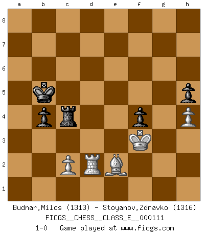 Last move : 1-0 2009 September 22 18:19:0 [Event "FICGS__CHESS__CLASS_E__000111"] [Site "FICGS"] [Date "2009.07.28"] [Round "1"] [White "Budnar,Milos"] [Black "Stoyanov,Zdravko"] [Result "1-0"] [WhiteElo "1313"] [BlackElo "1316"] 1.e4 c5 2.Nc3 a6 3.Nf3 Nc6 4.d4 d6 5.Be2 b5 6.O-O b4 7.Na4 f6 8.dxc5 h6 9.Be3 e5 10.Qd5 Bb7 11.Qe6+ Qe7 12.Qxe7 Bxe7 13.Rfd1 dxc5 14.Nxc5 Bxc5 15.Bxc5 Nge7 16.Nd2 O-O-O 17.Nc4 a5 18.Bxe7 Nxe7 19.Nd6+ Kb8 20.Nf7 Rxd1+ 21.Rxd1 Rf8 22.Nd6 Bc6 23.f3 Ng6 24.g3 Ne7 25.Nc4 Bb5 26.b3 Nc6 27.Rd5 Nd4 28.Bd1 Bxc4 29.bxc4 Rc8 30.c5 g5 31.f4 gxf4 32.gxf4 exf4 33.Rxd4 Rxc5 34.Rd2 Kc7 35.Kf2 f5 36.Kf3 fxe4+ 37.Kxe4 Rc4+ 38.Rd4 Rc3 39.Rd3 Rc4+ 40.Kf3 h5 41.h4 Kc6 42.a3 Kc5 43.axb4 axb4 44.Rd2 Kb5 45.Be2 1-0 Sicilian : Closed Kingside Castling by player White (move 6) Queenside Castling by player Black (move 16) 10 pieces endgame at move 43 : White KRBPP , Black KRPPP WHITE : King + 1 Rook 1 Bishop 2 Pawns BLACK : King + 1 Rook 3 Pawns Player White won this chess game. Follow this game move after move (download)Combinations have always been the most intriguing aspect of Chess. The masters look for them, the public applauds them, the critics praise them. It is because combinations are possible that Chess is more than a lifeless mathematical exercise. They are the poetry of the game; they are to Chess what melody is to music. They represent the triumph of mind over matter. (Reuben Fine) Dein Körper muss in Topform sein. Dein Schach verfällt, wenn dein Körper verfällt. Der Körper kann nicht vom Geist getrennt werden. (Robert James Fischer) Tu no necesitas jugar muy bien, únicamente ayudar a tu oponenet a que juegue muy mal. (Genrikh Chepukaitis) Plusieurs personnes se sont demandées comment Tal faisait pour gagner... En fait, c'est très simple ! Il met ses pièces au centre de l'échiquier et les sacrifie quelque part ! (David Bronstein) All politicians must be presumed guilty until they are proven innocent. (Dinesh De Silva)