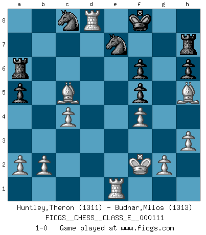 Last move : 1-0 2009 August 22 14:36:9 [Event "FICGS__CHESS__CLASS_E__000111"] [Site "FICGS"] [Date "2009.07.28"] [Round "1"] [White "Huntley,Theron"] [Black "Budnar,Milos"] [Result "1-0"] [WhiteElo "1311"] [BlackElo "1313"] 1.c4 d6 2.d4 c6 3.Nf3 Bg4 4.Nc3 e6 5.e4 Be7 6.Be2 c5 7.dxc5 dxc5 8.Qxd8+ Bxd8 9.Nb5 Ne7 10.Nd6+ Kf8 11.Nxb7 Bb6 12.Be3 Nc8 13.Nxc5 Ke7 14.e5 h6 15.h3 Bf5 16.Nd4 a5 17.Rd1 Bxc5 18.Nxf5+ exf5 19.Bxc5+ Ke8 20.f4 Nc6 21.Bf3 Ra6 22.Kf2 Nc6e7 23.Rd3 f6 24.exf6 gxf6 25.Re1 Rh7 26.Bh5+ Kf8 27.Rd8+ 1-0 English Opening Player White won this chess game. Follow this game move after move (download)There must have been a time when men were demigods, or they could not have invented Chess. (Gustav Schenk) Wenn du nicht weißt was du tun sollst, warte bis dein Gegner eine Idee hat. Sie wird sicher schlecht sein. (Siegbert Tarrasch) El Ajedrez es un invernadero donde los frutos del carácter pueden madurar mas completamente que en la vida. (Edward Morgan Foster) Echiquier : carré parfait, comme la Jérusalem nouvelle décrite par l'auteur de l'Apocalypse, huit cases sur huit, exaltation du chiffre 4, symbole du cosmos aux quatre horizons... où le noir et le blanc, l'ombre et la lumière, le mal et le bien s'entremêlent et se conjuguent. (Robert Couffignal, Le Gambit du poète) All the troubles of the world come from being unable to sit alone in a quiet room. (Blaise Pascal)