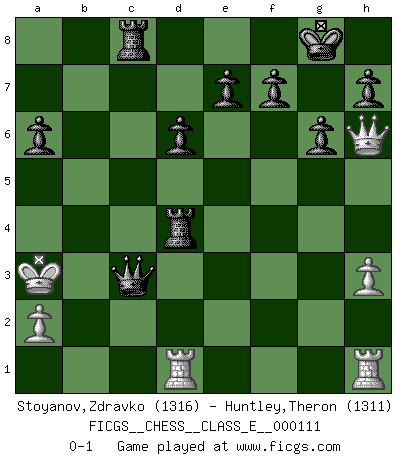 Last move : 0-1 2009 August 6 12:35:23 [Event "FICGS__CHESS__CLASS_E__000111"] [Site "FICGS"] [Date "2009.07.28"] [Round "1"] [White "Stoyanov,Zdravko"] [Black "Huntley,Theron"] [Result "0-1"] [WhiteElo "1316"] [BlackElo "1311"] 1.e4 d6 2.h3 Nf6 3.c3 c5 4.Nf3 Nc6 5.d3 g6 6.Qa4 Bg7 7.Bg5 O-O 8.d4 Nxe4 9.Be3 Qb6 10.Bb5 cxd4 11.cxd4 a6 12.Bxc6 bxc6 13.b3 c5 14.Nbd2 Nxd2 15.Nxd2 cxd4 16.Nc4 Qb7 17.Na5 Qxg2 18.O-O-O dxe3 19.Qf4 Be6 20.Qxe3 Rfc8+ 21.Nc4 Bxc4 22.bxc4 Rxc4+ 23.Kd2 Bh6 24.Qxh6 Qxf2+ 25.Kd3 Rd4+ 26.Kc3 Rc8+ 27.Kb3 Qc2+ 28.Ka3 Qc3+ 0-1 King's pawn Opening Kingside Castling by player Black (move 7) Queenside Castling by player White (move 18) Player Black won this chess game. Follow this game move after move (download)My God, Bobby Fischer plays so simply. (Alexei Suetin) Um dein Spiel zu verbessern musst du zuallererst das Endspiel studieren, denn diese kann unabhängig studiert werden. Die Eröffnung und das Mittelspiel müssen immer in Bezug gesetzt werden zum Endspiel. (José Raúl Capablanca) No todos los artistas son jugadores de Ajedrez, pero todos los jugadores de Ajedrez son artistas. (Marcel Duchamp) Dieu déplace le joueur, et celui-ci la pièce. Quel Dieu derrière Dieu commence donc la trame ? Arturo Perez-Reverte (prix de littérature policière 1993). A person who never made a mistake never tried anything new. (Albert Einstein)