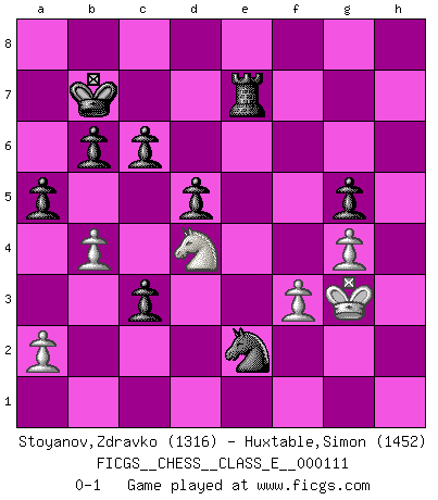Last move : 0-1 2009 November 9 15:23:36 [Event "FICGS__CHESS__CLASS_E__000111"] [Site "FICGS"] [Date "2009.07.28"] [Round "1"] [White "Stoyanov,Zdravko"] [Black "Huxtable,Simon"] [Result "0-1"] [WhiteElo "1316"] [BlackElo "1452"] 1.e4 c6 2.Nf3 d5 3.e5 Bg4 4.Be2 Nd7 5.h3 Bxf3 6.Bxf3 Nxe5 7.O-O Nf6 8.d4 Nxf3+ 9.Qxf3 g6 10.Re1 Bg7 11.Nd2 e6 12.Nb3 Ne4 13.c3 Qf6 14.Qxf6 Bxf6 15.f3 Bh4 16.Re2 Ng3 17.Re5 O-O-O 18.Bf4 Nf5 19.Nc5 Bf6 20.Re2 g5 21.Be5 Bxe5 22.Rxe5 h6 23.g4 Nh4 24.Kf2 Ng6 25.Re3 b6 26.Na6 Kb7 27.Nb4 Rde8 28.Kg3 f5 29.Rae1 f4+ 30.Kg2 fxe3 31.Rxe3 Nf4+ 32.Kg3 a5 33.Nc2 Rh7 34.Ne1 Rhe7 35.h4 e5 36.hxg5 hxg5 37.b4 exd4 38.Rxe7+ Rxe7 39.Nc2 dxc3 40.Nd4 Ne2+ 0-1 Caro-Kann defense Kingside Castling by player White (move 7) Queenside Castling by player Black (move 17) Player Black won this chess game. Follow this game move after move (download)Methodical thinking is of more use in Chess than inspiration. (C. J. S. Purdy) Schach ist Kampf, hauptsächlich jedoch gegen die eigenen Fehler. (Savielly Grigorievitsch Tartakower) Los Peones son el alma de una partida de Ajedrez. (Francois Andre Danican Philidor) C'est la seule position que je connaisse où les deux camps sont mals. Propos prêtés à V. Anand. He who laughs last probably does not get the joke. (Unknown)