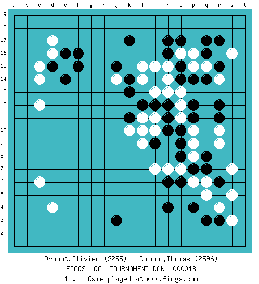 Last move : 1-0 2009 October 19 16:3:29 [Event "FICGS__GO__TOURNAMENT_DAN__000018 "] [Site "FICGS"] [Date "2009.08.30"] [Round "1"] [Black "Drouot,Olivier "] [White "Connor,Thomas "] [Result "1-0"] [Rating 1 "2255"] [Rating 2 "2596"] 1.q16 d4 2.p4 d17 3.j3 r14 4.o17 s16 5.r17 r4 6.r6 q5 7.r3 s3 8.q3 s5 9.q8 p6 10.n4 r10 11.n6 o7 12.r12 q15 13.p12 p16 14.q17 p10 15.o8 n7 16.o10 o11 17.p11 p9 18.p7 p8 19.q7 r9 20.o6 q6 21.n11 n15 22.n17 l15 23.m14 m15 24.o9 m7 25.r11 s7 26.d15 c12 27.f16 e15 28.e16 d16 29.e14 c15 30.f15 c14 31.j15 l14 32.k17 c6 33.l12 m13 34.p14 p15 35.o14 n14 36.o15 o16 37.n16 o13 38.q14 o12 39.r15 m10 40.m9 l9 41.l10 m11 42.m12 l11 43.k11 k10 44.n10 l10 45.n12 n13 46.k13 j14 47.k14 1-0 Here are the names of the openings (joseki) played in the four corners : Corner d4 : d4 j3Hoshi (Hwajeom, Seongjeom, Xingwei`) 4-4 Point. The star or hoshi (4-4) point, emphasizing influence at the potential expense of territory. Corner q16 : q16 r14Hoshi (Hwajeom, Seongjeom, Xingwei`) 4-4 Point. The star or hoshi (4-4) point, emphasizing influence at the potential expense of territory.Ikken Kakari (Hankan Keolch'im, Yi Gua`jiao~, 1-Space Low Approach). White 2 is the standard approach move to the 4-4. Corner q4 : p4 r4Takamoku (Gomok, Gaomu`) 5-4 Point. The takamoku (high) point (5-4). With its emphasis on influence, the 5-4 point complements the 4-4 (hoshi) point in creating an influence-oriented fuseki.Komoku. Black responds with 3-3, 3-5, 4-6, 4-7, 3-6, 3-7. Corner d16 : d17 d15Komoku (Somok, Xiao~mu`) 3-4 Point. The komoku (3-4) point is the traditional corner enclosure move..Ikken Takagakari (Hankan Nop'dakeolch'im, Yi Gaogua`jiao~, 1-Space High Approach). The 5-4 approach move has become more popular in modern times, as modern Go emphasizes speed and influence. Player Black won this Go (weiqi, baduk) game.Follow this game move after move (download ) Answer the keima with a kosumi. (Anonymous) Panic is a sudden desertion of us, an a going over to the enemy of our imagination. (Christian Nevell Bovee)