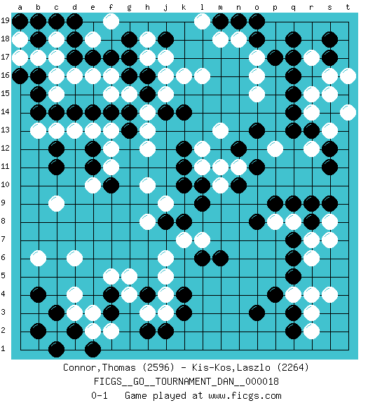 Last move : 0-1 2010 March 29 22:40:41 [Event "FICGS__GO__TOURNAMENT_DAN__000018"] [Site "FICGS"] [Date "2009.07.29"] [Round "1"] [Black "Connor,Thomas"] [White "Kis-Kos,Laszlo"] [Result "0-1"] [Rating 1 "2596"] [Rating 2 "2264"] 1.q16 d4 2.q3 d16 3.f3 d6 4.k4 r6 5.q5 s4 6.q6 r7 7.q9 r3 8.q2 r2 9.q7 g5 10.h4 k16 11.c11 c9 12.b16 c16 13.b15 b17 14.b18 c17 15.d14 o17 16.q14 j6 17.l6 b13 18.c12 c15 19.b14 c13 20.c14 d13 21.e14 f16 22.e12 e10 23.r8 p8 24.q18 r12 25.r13 p12 26.p9 s8 27.s9 q8 28.r9 q4 29.p4 r4 30.o3 s7 31.o8 r15 32.q15 s13 33.s14 r14 34.q13 s15 35.s12 t14 36.s11 r17 37.q17 o15 38.o13 e3 39.f4 f5 40.h16 g15 41.h15 h14 42.j14 j15 43.k14 l16 44.e17 e16 45.g14 h13 46.g13 h12 47.g16 f15 48.f17 h18 49.g18 h17 50.g17 j16 51.d18 c18 52.c19 b19 53.a19 a17 54.d19 a18 55.b19 f19 56.j18 j17 57.c3 d3 58.b4 b6 59.d2 e2 60.b2 d1 61.c1 c2 62.s17 s16 63.d2 g4 64.e1 f2 65.f10 f11 66.e11 f12 67.f14 e13 68.a16 f13 69.j8 k7 70.k10 h10 71.k12 j3 72.k3 j4 73.j2 j5 74.h2 h3 75.s18 t16 76.l9 l7 77.m6 e18 78.d17 l11 79.k11 m13 80.n12 l12 81.l10 j9 82.k8 h8 83.o18 n18 84.p17 o16 85.n19 m18 86.m19 l19 87.o19 m11 88.n10 n11 89.o11 m10 0-1 This go game has been lost on time (started : 2009.07.29 10:4:2) Here are the names of the openings (joseki) played in the four corners : Corner d4 : d4 f3 Hoshi (Hwajeom, Seongjeom, Xingwei`) 4-4 Point. The star or hoshi (4-4) point, emphasizing influence at the potential expense of territory. Ikken Kakari (Hankan Keolch'im, Yi Gua`jiao~, 1-Space Low Approach). Black 2 is the standard approach move to the 4-4. Corner q4 : q3 r6 Komoku (Somok, Xiao~mu`) 3-4 Point. The komoku (3-4) point is the traditional corner enclosure move.. Niken Kakari (Dukan Keolch'im, E`r Gua`jiao~, 2-Space Low Approach). White 2 is used with friendly forces backing it up. Its purpose is to prevent a pincer. Locally it results in a loss, but may be appropriate fuseki strategy. It was popular in the late 1950s and early 1960s, but is not seen often nowadays, having been replaced by the one-space high approach, with which it has points in common. Corner d16 : d16 c11 Hoshi (Hwajeom, Seongjeom, Xingwei`) 4-4 Point. The star or hoshi (4-4) point, emphasizing influence at the potential expense of territory. Corner q16 : q16 o17 Hoshi (Hwajeom, Seongjeom, Xingwei`) 4-4 Point. The star or hoshi (4-4) point, emphasizing influence at the potential expense of territory. Ikken Kakari (Hankan Keolch'im, Yi Gua`jiao~, 1-Space Low Approach). White 2 is the standard approach move to the 4-4. Player White won this Go (weiqi, baduk) game. Follow this game move after move (download)It is difficult to know exactly what you are doing. (Pierre Audouard) There are three kinds of lies: lies, damned lies and statistics. (Mark Twain)