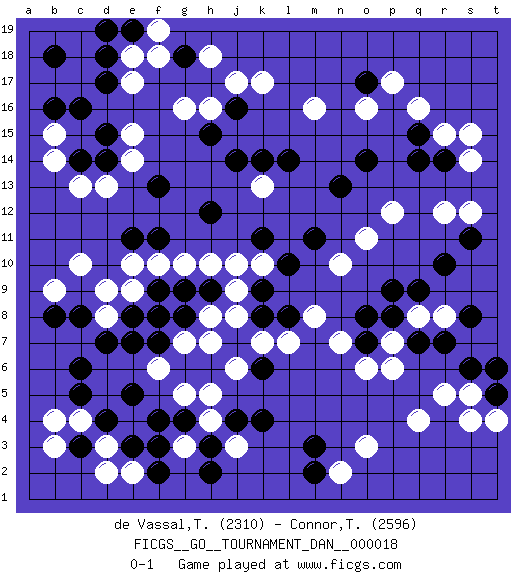 Last move : 0-1 2010 February 2 18:41:45 [Event "FICGS__GO__TOURNAMENT_DAN__000018"] [Site "FICGS"] [Date "2009.07.29"] [Round "1"] [Black "de Vassal,Thibault"] [White "Connor,Thomas"] [Result "0-1"] [Rating 1 "2310"] [Rating 2 "2596"] 1.d4 q16 2.d15 q4 3.d17 k17 4.r10 r12 5.r7 r5 6.q14 p12 7.o14 o16 8.n13 o11 9.l14 m16 10.s6 s5 11.s11 s12 12.m3 p7 13.p9 n10 14.o8 r15 15.j14 c10 16.j4 c13 17.c14 d13 18.c6 k13 19.k14 h16 20.h15 g16 21.h12 d3 22.e3 e2 23.c3 d2 24.f3 b3 25.f2 c4 26.c5 b4 27.f7 o3 28.j7 m8 29.g18 q8 30.q9 r8 31.s8 n7 32.o7 o6 33.q7 p6 34.p8 h10 35.f13 e15 36.d14 e14 37.f11 b14 38.c16 b15 39.b16 h8 40.k11 h7 41.k8 f8 42.e8 e9 43.f9 f10 44.g9 g10 45.h9 j9 46.g8 g7 47.f8 j8 48.k9 k10 49.l10 j10 50.o17 p17 51.k6 d9 52.e11 e10 53.m11 g5 54.e5 n2 55.m2 g3 56.g4 h4 57.f4 h5 58.h3 j3 59.h2 j6 60.k4 h18 61.b8 e18 62.b18 e17 63.d18 b9 64.e19 f19 65.d19 f18 66.j16 j17 67.r14 s14 68.t5 t4 69.t6 s4 70.q15 s15 71.c8 d8 72.d7 f6 73.e7 k7 74.l8 l7 0-1 Here are the names of the openings (joseki) played in the four corners : Corner q4 : q4 r7 Hoshi (Hwajeom, Seongjeom, Xingwei`) 4-4 Point. The star or hoshi (4-4) point, emphasizing influence at the potential expense of territory. Nikken Kakari (Dukan Keolch'im, E`r Gua`jiao~, 2-Space Low Approach). White typically answers by 7-3 or 3-5 (which is not joseki). Player White won this Go (weiqi, baduk) game. Follow this game move after move (download)The monkey jump is worth eight points. (Anonymous) The right perception of any matter and a misunderstanding of the same matter do not wholly exclude each other. (Kafka's the trial)