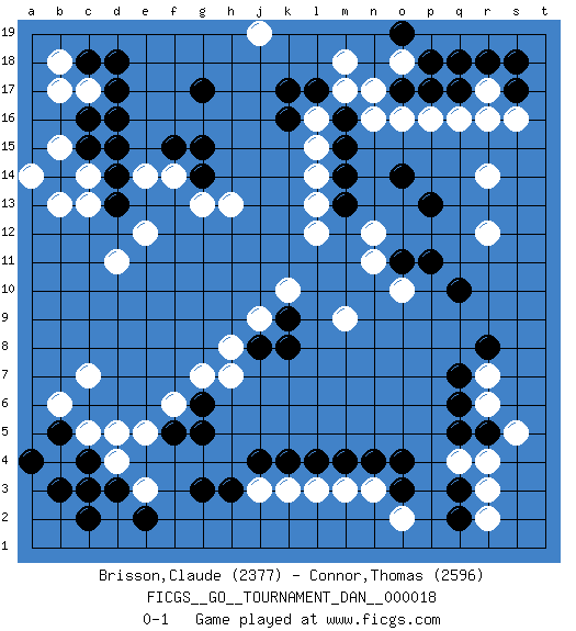 Last move : 0-1 2010 January 4 18:18:12 [Event "FICGS__GO__TOURNAMENT_DAN__000018 "] [Site "FICGS"] [Date "2009.07.29"] [Round "1"] [Black "Brisson,Claude "] [White "Connor,Thomas "] [Result "0-1"] [Rating 1 "2377"] [Rating 2 "2596"] 1.d16 q4 2.c4 q16 3.o3 r6 4.k4 e3 5.g3 c3 6.b3 d4 7.c2 c5 8.d3 b4 9.c3 d5 10.b5 b6 11.a4 c7 12.o17 r14 13.k16 c14 14.g17 d11 15.q2 r3 16.q18 r17 17.q10 m17 18.m16 l16 19.l17 l15 20.k17 n16 21.m15 n17 22.r18 l14 23.m14 l13 24.o14 o16 25.s17 s16 26.q17 r16 27.s18 o18 28.p17 p16 29.p18 n12 30.p13 r12 31.p11 o10 32.o11 n11 33.r8 m3 34.m4 l3 35.l4 k3 36.j4 n3 37.o4 j3 38.h3 o2 39.q3 r2 40.q5 r4 41.q6 r7 42.q7 m9 43.m13 l12 44.r5 s5 45.n4 e14 46.c16 h7 47.f15 f14 48.g15 h13 49.k8 j9 50.k9 k10 51.b14 b15 52.c15 b13 53.d14 c13 54.d13 e12 55.g14 g13 56.d15 a14 57.j8 h8 58.g5 f6 59.g6 g7 60.f5 e5 61.e2 b17 62.c18 c17 63.d17 b18 64.d18 m18 65.o19 j19 0-1 Here are the names of the openings (joseki) played in the four corners : Corner q4 : q4 o3Hoshi (Hwajeom, Seongjeom, Xingwei`) 4-4 Point. The star or hoshi (4-4) point, emphasizing influence at the potential expense of territory.Ikken Kakari (Hankan Keolch'im, Yi Gua`jiao~, 1-Space Low Approach). Black 2 is the standard approach move to the 4-4. Corner d4 : c4 e3Komoku (Somok, Xiao~mu`) 3-4 Point. The komoku (3-4) point is the traditional corner enclosure move..Ikken Kakari (Hankan Keolch'im, Yi Gua`jiao~, 1-Space Low Pincer). The small knight move is the basic approach move to the 3-4 point stone. It has been continually used for over four centuries. There are limitless variations, with new moves constantly being discovered. White 2 opens the door to a treaure store of joseki. Corner q16 : q16 o17Hoshi (Hwajeom, Seongjeom, Xingwei`) 4-4 Point. The star or hoshi (4-4) point, emphasizing influence at the potential expense of territory.Ikken Kakari (Hankan Keolch'im, Yi Gua`jiao~, 1-Space Low Approach). Black 2 is the standard approach move to the 4-4. Corner d16 : d16 c14Hoshi (Hwajeom, Seongjeom, Xingwei`) 4-4 Point. The star or hoshi (4-4) point, emphasizing influence at the potential expense of territory.Ikken Kakari (Hankan Keolch'im, Yi Gua`jiao~, 1-Space Low Approach). White 2 is the standard approach move to the 4-4. Player White won this Go (weiqi, baduk) game.Follow this game move after move (download ) In an unreasonable situation, an unreasonable move is reasonable. (Tamino) Depression is just anger without enthusiasm. (Unknown)