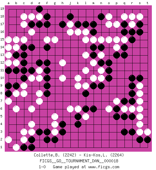 Last move : 1-0 2010 January 8 11:37:15 [Event "FICGS__GO__TOURNAMENT_DAN__000018"] [Site "FICGS"] [Date "2009.07.29"] [Round "1"] [Black "Collette,Benjamin"] [White "Kis-Kos,Laszlo"] [Result "1-0"] [Rating 1 "2242"] [Rating 2 "2264"] 1.q16 d4 2.q3 d16 3.f3 d6 4.k4 r6 5.q5 s4 6.r8 q6 7.r5 s5 8.r3 s7 9.p6 p7 10.q7 s8 11.r7 s6 12.r9 o6 13.p5 s9 14.r10 o17 15.s10 s3 16.m17 o15 17.q14 l16 18.m16 m15 19.l17 k16 20.k17 j16 21.h17 p14 22.q13 g15 23.f17 g5 24.h4 j6 25.c11 c9 26.c14 c15 27.d14 e18 28.f18 b12 29.c12 b14 30.b13 a13 31.c13 b15 32.f12 h12 33.f10 h10 34.f14 r17 35.q17 q18 36.r16 s18 37.s17 r18 38.l6 d10 39.d11 e10 40.f11 e11 41.e12 f15 42.b11 a12 43.a14 a15 44.a11 a14 45.b9 b8 46.c10 c8 47.f9 e8 48.a8 a7 49.a9 b6 50.d2 c3 51.o12 c2 52.l8 n10 53.m11 l9 54.m9 m10 55.l10 k9 56.n9 l11 57.o10 n11 58.n12 m12 59.o11 k10 60.e17 d18 61.d17 c17 62.e19 c18 63.s16 p17 64.s2 t3 65.m13 l13 66.m14 l15 67.e3 n13 68.n14 q15 69.r15 p15 70.p13 n15 71.n18 o18 72.f8 e7 73.c1 b1 74.d1 a2 75.t2 g4 76.h3 g3 77.g2 d3 78.f2 j17 79.j18 l5 80.k5 k6 81.m6 1-0 Here are the names of the openings (joseki) played in the four corners : Corner d4 : d4 f3 Hoshi (Hwajeom, Seongjeom, Xingwei`) 4-4 Point. The star or hoshi (4-4) point, emphasizing influence at the potential expense of territory. Ikken Kakari (Hankan Keolch'im, Yi Gua`jiao~, 1-Space Low Approach). Black 2 is the standard approach move to the 4-4. Corner q4 : q3 r6 Komoku (Somok, Xiao~mu`) 3-4 Point. The komoku (3-4) point is the traditional corner enclosure move.. Nikken Kakari (Dukan Keolch'im, E`r Gua`jiao~, 2-Space Low Approach). White 2 is used with friendly forces backing it up. Its purpose is to prevent a pincer. Locally it results in a loss, but may be appropriate fuseki strategy. It was popular in the late 1950s and early 1960s, but is not seen often nowadays, having been replaced by the one-space high approach, with which it has points in common. Corner q16 : q16 o17 Hoshi (Hwajeom, Seongjeom, Xingwei`) 4-4 Point. The star or hoshi (4-4) point, emphasizing influence at the potential expense of territory. Ikken Kakari (Hankan Keolch'im, Yi Gua`jiao~, 1-Space Low Approach). White 2 is the standard approach move to the 4-4. Player Black won this Go (weiqi, baduk) game. Follow this game move after move (download)Don't make dango's. (Anonymous) There's no money in correspondence chess. (John Knudsen)