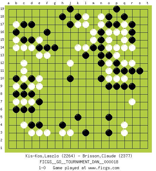 Last move : 1-0 2009 December 14 6:26:21 [Event "FICGS__GO__TOURNAMENT_DAN__000018"] [Site "FICGS"] [Date "2009.07.29"] [Round "1"] [Black "Kis-Kos,Laszlo"] [White "Brisson,Claude"] [Result "1-0"] [Rating 1 "2264"] [Rating 2 "2377"] 1.r16 q4 2.d17 c4 3.c15 l17 4.j17 p16 5.n16 n17 6.o17 o16 7.p17 q17 8.q18 q16 9.r17 n18 10.o18 m16 11.n15 p14 12.r15 q14 13.n13 m15 14.m14 o14 15.n14 l14 16.l13 j18 17.k18 k17 18.h18 l18 19.j19 k14 20.p12 q12 21.q11 r12 22.r11 o12 23.o13 p13 24.p11 r14 25.s11 o15 26.n12 o11 27.n10 o10 28.o9 p10 29.p9 q10 30.q9 q15 31.p19 f3 32.c9 r7 33.r9 e15 34.f16 c14 35.d15 d14 36.e14 e13 37.f14 c12 38.c6 f13 39.g14 d7 40.d6 c7 41.e7 b7 42.d4 d3 43.e4 e3 44.b6 d9 45.d10 b9 46.d8 e9 47.b8 c10 48.c8 e10 49.o3 q3 50.l3 j3 51.o5 b15 52.b16 b14 53.b10 c11 54.k5 b17 55.c17 j12 56.h4 h3 57.j10 1-0 Here are the names of the openings (joseki) played in the four corners : Corner q16 : r16 l17 Komoku (Somok, Xiao~mu`) 3-4 Point. The komoku (3-4) point is the traditional corner enclosure move.. Corner q4 : q4 o9 Hoshi (Hwajeom, Seongjeom, Xingwei`) 4-4 Point. The star or hoshi (4-4) point, emphasizing influence at the potential expense of territory. Player Black won this Go (weiqi, baduk) game. Follow this game move after move (download)More haste less speed. (John Fairbairn) I think your argument is specious - I think your tie is ugly. (Gregory House to Dr. Foreman, House M.D.)