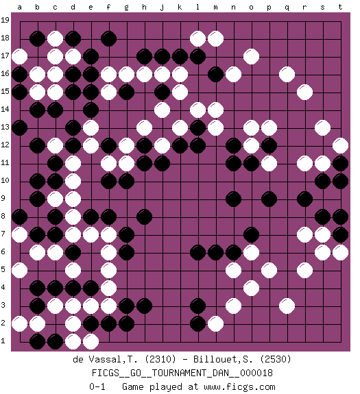 Last move : 0-1 2009 December 14 19:41:40 [Event "FICGS__GO__TOURNAMENT_DAN__000018"] [Site "FICGS"] [Date "2009.07.29"] [Round "1"] [Black "de Vassal,Thibault"] [White "Billouet,Simon"] [Result "0-1"] [Rating 1 "2310"] [Rating 2 "2530"] 1.d4 q16 2.d15 q3 3.r9 r5 4.l3 n3 5.h3 r11 6.p9 o17 7.c10 d17 8.f10 c15 9.l6 d14 10.e15 c16 11.g15 c12 12.j15 c3 13.c4 d3 14.b3 b2 15.b4 f3 16.e2 e3 17.f2 d2 18.g3 e1 19.g2 a2 20.c1 d1 21.b1 f5 22.c7 f7 23.g6 f6 24.h8 d7 25.d6 d8 26.c8 d10 27.e8 e7 28.f8 c9 29.b9 d9 30.c11 d11 31.e4 f4 32.f12 r15 33.n9 p11 34.o11 o12 35.p12 p13 36.n12 o13 37.n11 m14 38.l13 l14 39.k14 m13 40.l12 n5 41.m6 k16 42.k17 j16 43.j17 h16 44.h17 g16 45.f18 l18 46.l17 m18 47.e17 f16 48.e16 f15 49.d18 c18 50.e14 k15 51.d12 b8 52.b10 c6 53.b7 b6 54.a8 d5 55.a6 a5 56.b12 a7 57.a15 b15 58.a16 a14 59.b14 a17 60.a13 b16 61.d16 c17 62.b18 j14 63.j13 k13 64.k12 h13 65.h12 j12 66.j11 e12 67.d13 e13 68.c14 g12 69.h11 g11 70.g10 f11 71.g7 m2 72.l2 r7 73.s8 s7 74.s10 s11 75.t7 t6 76.t8 s6 77.t11 t12 78.t10 s13 79.n6 o6 80.o5 o4 81.o7 p5 82.m16 n16 0-1 Here are the names of the openings (joseki) played in the four corners : Corner q4 : q3 r9 Komoku (Somok, Xiao~mu`) 3-4 Point. The komoku (3-4) point is the traditional corner enclosure move.. Corner d16 : d15 d17 Takamoku (Gomok, Gaomu`) 5-4 Point. The takamoku (high) point (5-4). With its emphasis on influence, the 5-4 point complements the 4-4 (hoshi) point in creating an influence-oriented fuseki. Komoku. Black responds with 3-3, 3-5, 4-6, 4-7, 3-6, 3-7. Player White won this Go (weiqi, baduk) game. Follow this game move after move (download)Josekis are not fixed, definitive things. They indicate the moments when everything can change. (Pierre Audouard) Macintosh - we might not get everything right, but at least we knew the century was going to end. (Douglas Adams)