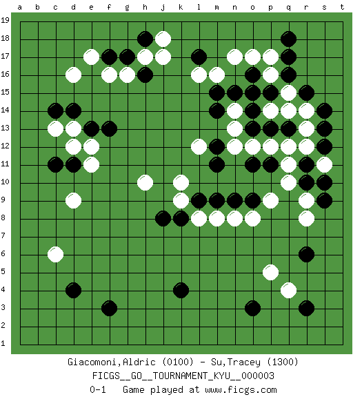 Last move : 0-1 2007 January 24 4:30:4 [Event "FICGS__GO__TOURNAMENT_KYU__000003"] [Site "FICGS"] [Date "2006.09.21"] [Round "1"] [Black "Giacomoni,Aldric"] [White "Su,Tracey"] [Result "0-1"] [Rating 1 "0100"] [Rating 2 "1300"] 1.q16 q4 2.d4 d16 3.r6 r9 4.o3 p5 5.r3 c6 6.f3 d9 7.f17 f16 8.d14 e17 9.g17 g16 10.h16 h17 11.h18 j17 12.l17 j18 13.c11 c13 14.c14 d13 15.e13 d12 16.d11 e12 17.f13 e11 18.r11 p9 19.p11 r13 20.r15 s11 21.s12 r12 22.s10 q11 23.r10 q10 24.s9 r8 25.s13 p12 26.o11 p17 27.q17 n17 28.o16 o17 29.q13 q14 30.p13 r14 31.s14 p14 32.o13 q12 33.o9 o8 34.n9 n8 35.m9 m8 36.l9 l8 37.k4 k9 38.k8 k10 39.m11 l12 40.m12 o12 41.o14 p16 42.o15 n12 43.m14 n13 44.p15 q15 45.q18 m16 46.m15 n14 47.n15 l16 48.j8 h10 0-1 Here are the names of the openings (joseki) played in the four corners : Corner q4 : q4 r6 Hoshi (Hwajeom, Seongjeom, Xingwei`) 4-4 Point. The star or hoshi (4-4) point, emphasizing influence at the potential expense of territory. Ikken Kakari (Hankan Keolch'im, Yi Gua`jiao~, 1-Space Low Approach). Black 2 is the standard approach move to the 4-4. Corner d4 : d4 c6 Hoshi (Hwajeom, Seongjeom, Xingwei`) 4-4 Point. The star or hoshi (4-4) point, emphasizing influence at the potential expense of territory. Ikken Kakari (Hankan Keolch'im, Yi Gua`jiao~, 1-Space Low Approach). White 2 is the standard approach move to the 4-4. Corner d16 : d16 f17 Hoshi (Hwajeom, Seongjeom, Xingwei`) 4-4 Point. The star or hoshi (4-4) point, emphasizing influence at the potential expense of territory. Ikken Kakari (Hankan Keolch'im, Yi Gua`jiao~, 1-Space Low Approach). Black 2 is the standard approach move to the 4-4. Player White won this Go (weiqi, baduk) game. Follow this game move after move (download)Josekis are not fixed, definitive things. They indicate the moments when everything can change. (Pierre Audouard) However beautiful the strategy, you should occasionally look at the results. (Winston Churchill)