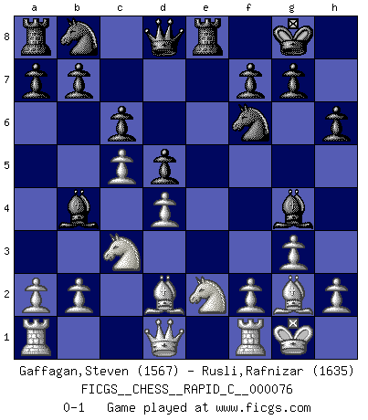Last move : 0-1 2009 October 5 8:53:43 [Event "FICGS__CHESS__RAPID_C__000076"] [Site "FICGS"] [Date "2009.07.29"] [Round "1"] [White "Gaffagan,Steven"] [Black "Rusli,Rafnizar"] [Result "0-1"] [WhiteElo "1567"] [BlackElo "1635"] 1.c4 e5 2.Nc3 Nf6 3.g3 Bc5 4.e3 d5 5.d4 exd4 6.exd4 Bb4 7.Bg5 Be6 8.Bg2 c6 9.c5 h6 10.Bd2 O-O 11.Nge2 Re8 12.O-O Bg4 0-1 This chess game has been lost on time (started : 2009.07.29 22:47:30) English : Carls' Bremen system Kingside Castling by player Black (move 10) Kingside Castling by player White (move 12) Player Black won this chess game. Follow this game move after move (download)As one by one I mowed them down, my superiority soon became apparent. (Jose Capablanca) Jeder Fehler erscheint unglaublich dumm, wenn andre ihn begehen. (Georg Christoph Lichtenberg) Tu eres para mi la Reina en d8 y yo soy el Peón en d7!!. (GM Eduard Gufeld) Votre prénom est 'Tactique', votre deuxième prénom est 'Tactique' et votre nom est 'Tactique'. (Ken Smith) Ah, the Socrating method. The best way we have of teaching everything-apart from juggling chainsaws. (Gregory House, House M.D.)