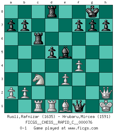 Last move : 0-1 2009 November 1 17:58:3 [Event "FICGS__CHESS__RAPID_C__000076"] [Site "FICGS"] [Date "2009.07.29"] [Round "1"] [White "Rusli,Rafnizar"] [Black "Hrubaru,Mircea"] [Result "0-1"] [WhiteElo "1635"] [BlackElo "1591"] 1.d4 d5 2.c4 c6 3.Nc3 Nf6 4.Nf3 e6 5.e3 Nbd7 6.Qc2 Bd6 7.Bd3 O-O 8.O-O e5 9.cxd5 cxd5 10.dxe5 Nxe5 11.Nxe5 Bxe5 12.Bd2 Be6 13.Rfd1 Rc8 14.Qa4 Ng4 15.h3 Bh2+ 16.Kf1 Ne5 17.Be2 Nc4 18.Qc2 Qf6 19.Rac1 Bg3 20.f3 Rfd8 21.Bxc4 Rxc4 22.Be1 Be5 23.Qe2 Rc6 24.Kg1 Qg6 25.Kh1 Qh6 26.f4 Bxh3 27.gxh3 Qxh3+ 28.Qh2 Qf1+ 0-1 QGD Slav defense Kingside Castling by player Black (move 7) Kingside Castling by player White (move 8) Player Black won this chess game. Follow this game move after move (download)When you absolutely don't know what to do anymore, it is time to panic. (John van der Wiel) Wer wird heute Abend ihr Gegner sein? -- Heute Abend spiele ich gegen die schwarzen Steine. (Akiba Rubinstein) Sin errores no puede haber brillantez. (Emanuel Lasker) Il n'y a plus de joueurs du niveau de Jacob Murray dont la seule quête est le beau jeu, le plaisir de voir les pièces construire quelque chose. Sur 10 idées à la minute, 9 seront sans intérêt, la dernière s'avèrera géniale. (Christian Bauer) Nobody is always a winner, and anybody who says he is, is either a liar or doesn't play poker. (Amarillo Slim)