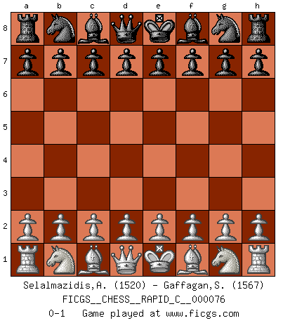 Last move : 0-1 2009 August 29 9:37:7 [Event "FICGS__CHESS__RAPID_C__000076"] [Site "FICGS"] [Date "2009.07.29"] [Round "1"] [White "Selalmazidis,Arsenis"] [Black "Gaffagan,Steven"] [Result "0-1"] [WhiteElo "1520"] [BlackElo "1567"] 0-1 This chess game has been lost on time (started : 2009.07.29 22:47:30) Player Black won this chess game. Follow this game move after move (download)Chess is 99 percent tactics. (Teichmann) Es war undenkbar für die Behörden, dass ein sowjetischer Großmeister auf diese Art und Weise [Fischer-Taimanov 6:0] verliert, ohne dass es eine politischer Erklärung dafür gäbe. (Mark Taimanov) Me gusta decir que Bobby Fischer fue el mejor jugador que jamás haya existido. Pero lo que hizo de Fischer un genio, fue su habilidad de mezclar una frescura y pragmatismo Americano con ideas Rusas acerca de la estrategia. (Bruce Pandolfini) Je menace de comprendre la position. (Anonyme) In every real man a child is hidden that wants to play. (Friedrich Nietzsche)