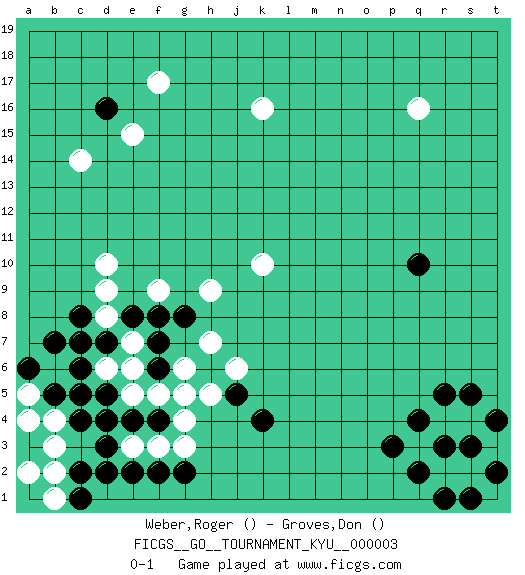 Last move : 0-1 2006 December 8 17:31:38 [Event "FICGS__GO__TOURNAMENT_KYU__000003"] [Site "FICGS"] [Date "2006.09.21"] [Round "1"] [Black "Weber,Roger"] [White "Groves,Don"] [Result "0-1"] 1.d4 q16 2.d16 q3 3.q10 k16 4.k4 d10 5.q4 r4 6.r5 s2 7.r3 s4 8.q2 r2 9.p3 c14 10.r1 f17 11.s3 e15 12.t2 k10 13.s1 d6 14.s5 f3 15.t4 e5 16.d2 e3 17.d3 b4 18.d5 c5 19.c4 b3 20.e4 g4 21.c6 b6 22.b5 a5 23.c5 c7 24.b7 b2 25.a6 a4 26.d7 e6 27.c8 d9 28.c2 b1 29.c1 a2 30.f4 g6 31.f6 f5 32.g2 g3 33.f7 h5 34.f2 e7 35.e8 g5 36.g8 h7 37.e2 d8 38.c7 f9 39.f8 h9 40.j5 j6 0-1 This go game has been lost on time (started : 2006.09.21 4:4:5) Here are the names of the openings (joseki) played in the four corners : Corner q4 : q3 q4 Komoku (Somok, Xiao~mu`) 3-4 Point. The komoku (3-4) point is the traditional corner enclosure move.. Corner d16 : d16 c14 Hoshi (Hwajeom, Seongjeom, Xingwei`) 4-4 Point. The star or hoshi (4-4) point, emphasizing influence at the potential expense of territory. Ikken Kakari (Hankan Keolch'im, Yi Gua`jiao~, 1-Space Low Approach). White 2 is the standard approach move to the 4-4. Corner d4 : d4 d6 Hoshi (Hwajeom, Seongjeom, Xingwei`) 4-4 Point. The star or hoshi (4-4) point, emphasizing influence at the potential expense of territory. Ikken Takagakari (Hankan Nop'dakeolch'im, Yi Gaojia, 1-Space High Approach). Black typically responds at 6-4 or 3-10. Black 4-10 is played when Black finds play on the right side advantageous. Black 4-8 or 3-8 may be played when Black has support at top. Player White won this Go (weiqi, baduk) game. Follow this game move after move (download)The simplest move is the best move. (Anonymous) Hardware: the parts of a computer that can be kicked. (Jeff Persis)