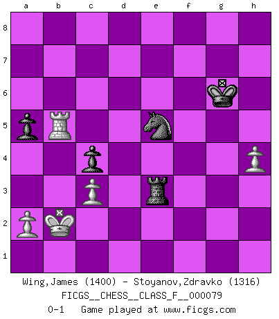 Last move : 0-1 2009 October 24 8:22:47 [Event "FICGS__CHESS__CLASS_F__000079"] [Site "FICGS"] [Date "2009.07.30"] [Round "1"] [White "Wing,James"] [Black "Stoyanov,Zdravko"] [Result "0-1"] [WhiteElo "1400"] [BlackElo "1316"] 1.e4 c5 2.d4 b6 3.d5 e6 4.e5 exd5 5.Qxd5 Nc6 6.Bc4 Qe7 7.Nf3 Bb7 8.Bg5 f6 9.Bf4 fxe5 10.Bxe5 d6 11.Qxd6 Qxd6 12.Bxd6 Bxd6 13.Nc3 Nb4 14.O-O-O O-O-O 15.Ng5 Bf4+ 16.Kb1 Bxg5 17.Rxd8+ Bxd8 18.Nb5 Kb8 19.Rd1 Nf6 20.Nd6 Bc7 21.Nf7 Rf8 22.g3 Nc6 23.Ng5 h6 24.Ne6 Re8 25.Nxg7 Re5 26.f4 Re7 27.Nf5 Re4 28.b3 Ng4 29.Rd2 Bd8 30.Bd5 Re1+ 31.Kb2 Bf6+ 32.Ka3 b5 33.b4 Nxb4 34.Bxb7 Kxb7 35.c3 Nc6 36.Rd3 h5 37.h4 Nh2 38.Ne3 Rc1 39.Nd5 Bg7 40.Kb2 Rg1 41.Ne3 c4 42.Rd7+ Kb6 43.Rxg7 a5 44.Rg6 Nf3 45.Nf5 Nfe5 46.fxe5 Kc5 47.Ne3 Nxe5 48.Rg5 Kd6 49.Rxh5 Ke6 50.Rh6+ Kf7 51.Rb6 Rxg3 52.Rb7+ Kg6 53.Rxb5 Rxe3 0-1 Sicilian : Smith-Morra gambit Queenside Castling by player White (move 14) Queenside Castling by player Black (move 14) 10 pieces endgame at move 53 : White KRPPP , Black KRNPP WHITE : King + 1 Rook 3 Pawns BLACK : King + 1 Rook 1 Knight 2 Pawns Player Black won this chess game. Follow this game move after move (download)Winning isn't everything... but losing is nothing. (Mednis) Dass jemand wie Surab Asmaiparaschwili, der selbst Elopunkte gekauft hat , Vize-Präsident der Fide werden konnte, sagt schon einges über den Zustand dieser Organisation aus. (Joel Lautier) Una buena memoria, concentración, imaginación y una fuerte voluntad, se requiere para llegar a ser un buen jugador. (Bobby Fischer) Le système Elo représente seulement une moyenne. Il est simplement un indicateur de votre stabilité. (Anatoli Karpov) Life is the sum of all your choices. (Albert Camus)