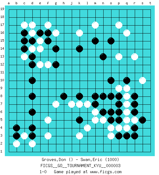 Last move : 1-0 2006 December 14 6:25:5 [Event "FICGS__GO__TOURNAMENT_KYU__000003 "] [Site "FICGS"] [Date "2006.09.21"] [Round "1"] [Black "Groves,Don "] [White "Swan,Eric "] [Result "1-0"] [Rating 2 "1000"] 1.d4 q16 2.r4 d16 3.d10 o3 4.q10 k3 5.k5 k16 6.r6 l4 7.p3 o4 8.o5 f3 9.d6 r13 10.c14 c3 11.d3 d2 12.b4 b2 13.b3 f17 14.k14 e14 15.g14 e12 16.d12 f12 17.g12 p17 18.m15 m17 19.o15 p13 20.n13 f5 21.d8 m5 22.n6 m6 23.m7 s10 24.r8 p4 25.q3 n7 26.n8 o7 27.p5 q5 28.p6 q4 29.r3 r5 30.s5 q6 31.p7 q7 32.p8 q8 33.r7 l7 34.m8 n5 35.o6 p9 36.o8 q9 37.o10 j7 38.k8 k7 39.h8 g7 40.c16 c17 41.d15 e15 42.e16 d17 43.f16 g16 44.f15 d14 45.c15 c13 46.d13 1-0 This go game has been lost on time (started : 2006.09.21 4:4:5) Here are the names of the openings (joseki) played in the four corners : Corner q4 : r4 o3Komoku (Somok, Xiao~mu`) 3-4 Point. The komoku (3-4) point is the traditional corner enclosure move..Nikken Kakari (Dukan Keolch'im, E`r Gua`jiao~, 2-Space Low Approach). White 2 is used with friendly forces backing it up. Its purpose is to prevent a pincer. Locally it results in a loss, but may be appropriate fuseki strategy. It was popular in the late 1950s and early 1960s, but is not seen often nowadays, having been replaced by the one-space high approach, with which it has points in common. Corner d4 : d4 f3Hoshi (Hwajeom, Seongjeom, Xingwei`) 4-4 Point. The star or hoshi (4-4) point, emphasizing influence at the potential expense of territory.Ikken Kakari (Hankan Keolch'im, Yi Gua`jiao~, 1-Space Low Approach). White 2 is the standard approach move to the 4-4. Corner d16 : d16 c14Hoshi (Hwajeom, Seongjeom, Xingwei`) 4-4 Point. The star or hoshi (4-4) point, emphasizing influence at the potential expense of territory.Ikken Kakari (Hankan Keolch'im, Yi Gua`jiao~, 1-Space Low Approach). Black 2 is the standard approach move to the 4-4. Player Black won this Go (weiqi, baduk) game.Follow this game move after move (download ) Proverbs do not apply to White. (Tero Sand) The obstacle is the path. (Zen proverb)