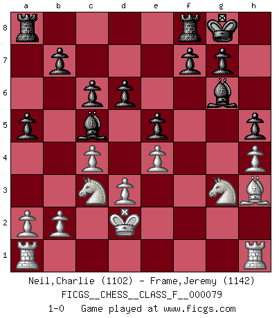 Last move : 1-0 2009 August 10 8:12:14 [Event "FICGS__CHESS__CLASS_F__000079"] [Site "FICGS"] [Date "2009.07.30"] [Round "1"] [White "Neil,Charlie"] [Black "Frame,Jeremy"] [Result "1-0"] [WhiteElo "1102"] [BlackElo "1142"] 1.c4 e5 2.g3 Bc5 3.Bg2 Nc6 4.Nc3 Nf6 5.d3 d6 6.e4 Bg4 7.f3 Bh5 8.Bd2 O-O 9.g4 Bg6 10.Nge2 h6 11.Ng3 a5 12.Qb3 Nd4 13.Qd1 c6 14.h4 h5 15.g5 Qe7 16.gxf6 Qxf6 17.Bh3 Nxf3+ 18.Ke2 Nxd2 19.Qxd2 Qf2+ 20.Kd1 Qxd2+ 21.Kxd2 1-0 English Opening Kingside Castling by player Black (move 8) Player White won this chess game. Follow this game move after move (download)Chess is war over the board. The object is to crush the opponents mind. (Bobby Fischer) Wir können eben der zündenden Macht des Opfers nicht wiederstehen, denn die Begeisterung für das Opfer liegt in der Natur des Menschen. (Rudolf Spielmann) Me gusta decir que Bobby Fischer fue el mejor jugador que jamás haya existido. Pero lo que hizo de Fischer un genio, fue su habilidad de mezclar una frescura y pragmatismo Americano con ideas Rusas acerca de la estrategia. (Bruce Pandolfini) En blitz, le Cavalier l'emporte sur le Fou. (Vlastimil Hort) Drag your thoughts away from your troubles... by the ears, by the heels, or any other way you can manage it. (Mark Twain)