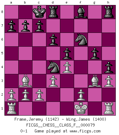 Last move : 0-1 2009 August 5 0:54:5 [Event "FICGS__CHESS__CLASS_F__000079"] [Site "FICGS"] [Date "2009.07.30"] [Round "1"] [White "Frame,Jeremy"] [Black "Wing,James"] [Result "0-1"] [WhiteElo "1142"] [BlackElo "1400"] 1.e4 e5 2.Nf3 Nc6 3.Bc4 d6 4.Nc3 Bg4 5.h3 Bxf3 6.Qxf3 Qf6 7.Nd5 Qxf3 8.gxf3 O-O-O 9.d3 Nd4 10.Bb3 Nxf3+ 11.Ke2 Nd4+ 12.Kf1 h5 13.Bg5 f6 14.Bh4 g5 15.Nxf6 Nxf6 16.Bg3 h4 0-1 King's pawn game Queenside Castling by player Black (move 8) Player Black won this chess game. Follow this game move after move (download)No one ever won a game by resigning. (Unknown) Es ist nicht das erste mal, dass sich die FIDE dem Arabischen Geld gebeugt hat (über die FIDE WM 2004 in Lybien). (Larry Evans) Por la belleza de sus partidas, la claridad de su juego y lo brillante de sus ideas, Fischer se creó el mismo como un artista de la misma estatura como Brahms, Rembrandt y Shakespeare. (David Levy) Les Echecs ne sont pas pour les âmes timides. Ils requièrent un homme entier, qui ne s'arrête pas aveuglément à ce qui a été déjà établi, mais qui tente individuellement de sonder les profondeurs du jeu. (W. Steinitz) The Movers & Shakers of this world are those who play chess in the mornings and go to the disco in the evenings. (Dinesh De Silva)