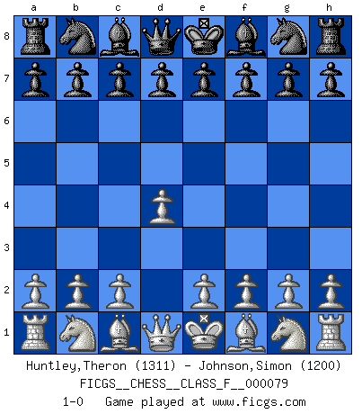 Last move : 1-0 2009 September 8 21:43:49 [Event "FICGS__CHESS__CLASS_F__000079"] [Site "FICGS"] [Date "2009.07.30"] [Round "1"] [White "Huntley,Theron"] [Black "Johnson,Simon"] [Result "1-0"] [WhiteElo "1311"] [BlackElo "1200"] 1.d4 1-0 This chess game has been lost on time (started : 2009.07.30 0:22:36) Queen's pawn Player White won this chess game. Follow this game move after move (download)The stomach is an essential part of the Chess master. (Bent Larsen) Wenn Du absolut nicht mehr weißt, was Du tun sollst, dann ist es Zeit für Panik. (John van der Wiel) ¿Porque tengo que perder ante este idiota?. (Aron Nimzovich) C'est une question de caractère, Beaucoup de gens perdent leur motivation très vite. D'autres, ils sont rares, peuvent la conserver très longtemps. J'aime les échecs, encore aujourd'hui je suis heureux d'analyser des parties. J'aime toujours gagner, je déteste encore perdre. Bien jouer est important pour mon intégrité intellectuelle et morale. Et puis les échecs vivent en ce moment une période historique grâce à Internet. Ils se développent dans les systèmes éducatifs à travers le monde. Ils sortent de leur ghetto, et c'est mon rôle de mener à bien cette révolution. (Gary Kasparov) Waiting for chance ? Play in casinos. (FICGS proverb)