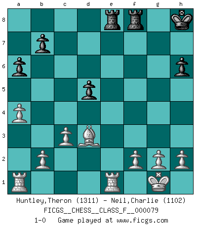 Last move : 1-0 2009 August 14 11:2:42 [Event "FICGS__CHESS__CLASS_F__000079"] [Site "FICGS"] [Date "2009.07.30"] [Round "1"] [White "Huntley,Theron"] [Black "Neil,Charlie"] [Result "1-0"] [WhiteElo "1311"] [BlackElo "1102"] 1.e4 e6 2.d4 d5 3.Nd2 c5 4.Ngf3 Nc6 5.exd5 exd5 6.Bb5 Nf6 7.O-O Be6 8.Qe2 Be7 9.dxc5 Bxc5 10.Nb3 O-O 11.Nxc5 Qb6 12.Nxe6 fxe6 13.Qxe6+ Kh8 14.a4 a6 15.Be3 Qc7 16.Bd3 Rae8 17.Qh3 Ne5 18.Nxe5 Qxe5 19.c3 Qd6 20.Bd4 h5 21.Bxf6 Qxf6 22.Qxh5+ Qh6 23.Qxh6+ gxh6 24.Rfe1 1-0 French : Tarrasch, Open variation Kingside Castling by player White (move 7) Kingside Castling by player Black (move 10) Player White won this chess game. Follow this game move after move (download)A man that will take back a move at Chess will pick a pocket. (Richard Fenton) Computer sind die einzigen Gegner, die nicht immer eine Ausrede auf Lager haben, wenn sie gegen mich verlieren. (Robert James Fischer) El Ajedrez es de 30 a 40 por ciento psicología. Uno no cuenta con esto cuando se juega contra una computadora. No lo puedo confundir. (Judith Polgar) Que feriez-vous si vous étiez en train de jouer aux échecs et que la fin du monde arrive ? Je continuerais à jouer. (Saint Borromée) Statistics can be made to prove anything - even the truth. (Author unknown)