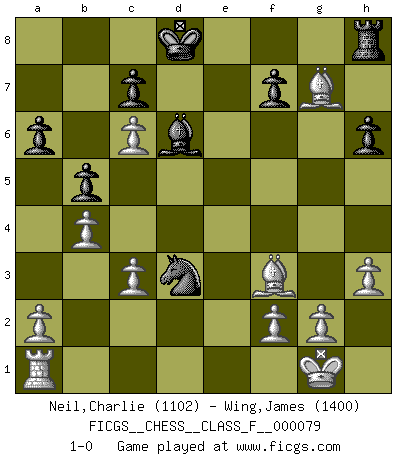 Last move : 1-0 2009 October 26 7:33:54 [Event "FICGS__CHESS__CLASS_F__000079"] [Site "FICGS"] [Date "2009.07.30"] [Round "1"] [White "Neil,Charlie"] [Black "Wing,James"] [Result "1-0"] [WhiteElo "1102"] [BlackElo "1400"] 1.e4 e5 2.Nf3 Nc6 3.Bb5 Nge7 4.c3 a6 5.Ba4 d6 6.O-O Bd7 7.d4 Bg4 8.d5 b5 9.Bc2 Ng6 10.dxc6 h6 11.Re1 Qf6 12.Be3 Nf4 13.Nbd2 d5 14.h3 dxe4 15.Bxe4 Bxf3 16.Nxf3 Be7 17.Qd7+ Kf8 18.Nxe5 Qxe5 19.Bd4 Qd6 20.Qxd6 Bxd6 21.Bf3 Nd3 22.Re2 Re8 23.Rxe8+ Kxe8 24.b4 Kd8 25.Bxg7 1-0 Ruy Lopez : Cozio defense Kingside Castling by player White (move 6) Player White won this chess game. Follow this game move after move (download)Some sacrifices are sound; the rest are mine. (Mikhail Tal) Fischer machte Schach einfach zu einer aufregenden Sache, wann immer er sich ans Brett setzte. (Raymond Keene) Uno no tiene que jugar muy bien, es suficiente jugar mejor que el oponente. (Siegbert Tarrasch) Il a essayé de se convaincre qu'il pourrait empêcher toutes les erreurs et ne jamais perdre. L'horreur ! Gary Kasparov au sujet de Robert Fischer. He who fights with monsters should be careful lest he thereby become a monster. (Friedrich Nietzsche, Beyond Good and Evil)