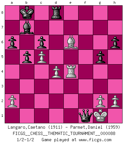 Last move : 1/2-1/2 2009 October 23 17:36:5 [Event "FICGS__CHESS__THEMATIC_TOURNAMENT__000088"] [Site "FICGS"] [Date "2009.07.31"] [Round "1"] [White "Langaro,Caetano"] [Black "Parmet,Daniel"] [Result "1/2-1/2"] [WhiteElo "1911"] [BlackElo "1959"] 1.d4 d5 2.c4 c6 3.Nc3 Nf6 4.Nf3 e6 5.Bg5 h6 6.Bh4 dxc4 7.e4 g5 8.Bg3 b5 9.Be2 Bb7 10.Ne5 Nbd7 11.O-O Bg7 12.Nxd7 Nxd7 13.Bd6 a6 14.Bh5 Bf8 15.Bxf8 Rxf8 16.e5 Qb6 17.b3 O-O-O 18.bxc4 Nxe5 19.c5 Qa5 20.Ne4 Nc4 21.Be2 f5 22.Bxc4 fxe4 23.Bxe6+ Kb8 24.Re1 Qc3 25.Rxe4 Qb2 26.Qe1 Rxf2 27.Qxf2 Qxa1+ 28.Qf1 Qxf1+ 1/2-1/2 QGD Slav defense Kingside Castling by player White (move 11) Queenside Castling by player Black (move 17) This chess game ended in a draw. Follow this game move after move (download)The Pin is mightier than the sword. (Fred Reinfeld) Versuche, dich von der Sklaverei der Eröffnungsvarianten zu befreien. Stattdessen soll man gewisse Typenpositionen erlernen, die man eingehend analysiert. (Aaron Nimzowitsch) El Ajedrez es como la guerra en un tablero. (Bobby Fischer) La vie et les Echecs sont tous les deux une lutte constante. (Lasker) Men should grow up. - Yeah. And dogs should stop licking themselves. It's not gonna happen. (Gregory House to Dr. Cameron, House M.D.)