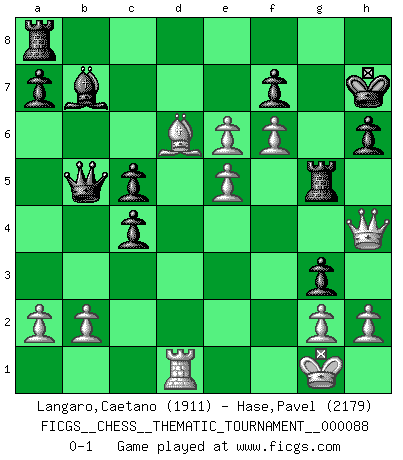 Last move : 0-1 2010 January 28 8:37:5 [Event "FICGS__CHESS__THEMATIC_TOURNAMENT__000088"] [Site "FICGS"] [Date "2009.07.31"] [Round "1"] [White "Langaro,Caetano"] [Black "Hase,Pavel"] [Result "0-1"] [WhiteElo "1911"] [BlackElo "2179"] 1.d4 d5 2.c4 c6 3.Nc3 Nf6 4.Nf3 e6 5.Bg5 h6 6.Bh4 dxc4 7.e4 g5 8.Bg3 b5 9.Be2 Bb7 10.O-O Be7 11.Ne5 Nbd7 12.Bh5 O-O 13.f4 Nxe5 14.fxe5 Nxh5 15.Qxh5 Kg7 16.Rad1 Qe8 17.Rf6 Bxf6 18.exf6+ Kh7 19.Bd6 Rg8 20.e5 c5 21.d5 g4 22.Nxb5 Rg5 23.Qh4 Qxb5 24.dxe6 g3 0-1 This chess game has been lost on time (started : 2009.07.31 12:58:57) QGD Slav defense Kingside Castling by player White (move 10) Kingside Castling by player Black (move 12) Player Black won this chess game. Follow this game move after move (download)Do you realize Fischer almost never has any bad pieces? He exchanges them, and the bad pieces remain with his opponents. (Yuri Balashov) Man kann eine Schachpartie nur gewinnen, wenn das Gleichgewicht gestört ist. In einer Stellung mit ungestörtem Gleichgewicht ist auch das größte Genie hilflos - in der Stellung steckt dann eben kein genialer Einfall. (Wilhelm Steinitz) A la fecha, Fischer esta simplemente un nivel arriba de todos los mejores jugadores de Ajedrez del mundo. (John Jacobs) Lorsque vous vous retrouvez devant une position atroce, ne tendez pas un ultime piège dérisoire avec l'intention d'abandonner si l'adversaire le déjoue ! Faites-vous plutôt un devoir de résister comme si votre vie en dépendait. Jouez le coup qui vous déplairait au centuple si vous étiez dans la peau de votre tortionnaire ! If you work for a living, why do you kill yourself working ? (Tuco to a chicken in The Good, The Bad and The Ugly)