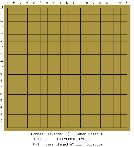 Last move : 0-1 2006 October 21 7:1:6 [Event "FICGS__GO__TOURNAMENT_KYU__000003"] [Site "FICGS"] [Date "2006.09.21"] [Round "1"] [Black "Barbee,Alexander"] [White "Weber,Roger"] [Result "0-1"] 0-1 This go game has been lost on time (started : 2006.09.21 4:4:5) Here are the names of the openings (joseki) played in the four corners : Player White won this Go (weiqi, baduk) game. Follow this game move after move (download)The comb formation is alive. (Anonymous) There are two types of people in this world, good and bad. The good sleep better, but the bad seem to enjoy the waking hours much more. (Woody Allen)