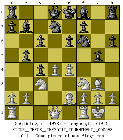 Last move : 0-1 2009 September 26 21:36:1 [Event "FICGS__CHESS__THEMATIC_TOURNAMENT__000088"] [Site "FICGS"] [Date "2009.07.31"] [Round "1"] [White "Suhodolov,Dmitry"] [Black "Langaro,Caetano"] [Result "0-1"] [WhiteElo "1993"] [BlackElo "1911"] 1.d4 d5 2.c4 c6 3.Nc3 Nf6 4.Nf3 e6 5.Bg5 h6 6.Bh4 dxc4 7.e4 g5 8.Bg3 b5 9.Be2 Bb7 10.O-O Nbd7 0-1 QGD Slav defense Kingside Castling by player White (move 10) Player Black won this chess game. Follow this game move after move (download)Chess books should be used as we use glasses: to assist the sight, although some players make use of them as if they thought they conferred sight. (Jose Raul Capablanca) Wenn sie aufgeben, dann danke ich Ihnen für das Spiel (Eventualzug beim Fernschach). (Anonymous) Diferente gente reacciona diferentemente en aceptar la derrota. (Bobby Fischer) Vouloir jouer aux échecs contre soi-même est aussi paradoxal que vouloir marcher sur son ombre. (Stefan Zweig) Watch your thoughts; they become words. Watch your words; they become actions. Watch your actions; they become habits. Watch your habits; they become character. Watch your character; it becomes your destiny. (Frank Outlaw)