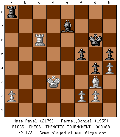 Last move : 1/2-1/2 2009 October 29 17:10:53 [Event "FICGS__CHESS__THEMATIC_TOURNAMENT__000088"] [Site "FICGS"] [Date "2009.07.31"] [Round "1"] [White "Hase,Pavel"] [Black "Parmet,Daniel"] [Result "1/2-1/2"] [WhiteElo "2179"] [BlackElo "1959"] 1.d4 d5 2.c4 c6 3.Nc3 Nf6 4.Nf3 e6 5.Bg5 h6 6.Bh4 dxc4 7.e4 g5 8.Bg3 b5 9.Be2 Bb7 10.h4 g4 11.Ne5 h5 12.O-O Nbd7 13.Qc2 Nxe5 14.Bxe5 Bg7 15.Rad1 O-O 16.Bg3 Nd7 17.e5 c5 18.Nxb5 cxd4 19.Nxd4 Bd5 20.Nf5 Bxe5 21.Qd2 Qf6 22.Ne3 Bxb2 23.Nxd5 exd5 24.Qxd5 Ne5 25.Bxc4 Rfd8 26.Qb5 Nxc4 27.Qxc4 Qf5 28.Kh2 Kg7 29.Qc7 Bf6 30.Rxd8 Rxd8 31.Qxa7 Rd2 32.Qa8 Qd5 33.Qxd5 Rxd5 34.Rc1 Ra5 35.Rc2 Ra4 36.Kg1 Kg6 37.Kf1 Ra8 38.Ke2 Be7 39.Kd3 f5 40.Rc6+ 1/2-1/2 QGD Slav defense Kingside Castling by player White (move 12) Kingside Castling by player Black (move 15) This chess game ended in a draw. Follow this game move after move (download)All I want to do, ever, is just play Chess. (Bobby Fischer) Je mehr ich von der FIDE weiss, um so weniger verstehe ich. (Alexander Kalifman) El Peón aislado arroja penumbra sobre todo el tablero. (Aaron Nimzovich) Toute estimation doit être constamment réévaluée. (Jacob Estrin) . 'gn is not allowed in chess unless n is an integer between 1 and 8 inclusive, where 1 and 8 are to interpreted as the standard numerals standing for integers in the ordered real-closed field R, with the *canonical* ordering. (As opposed to, say, an integer in the domain Z[2+i*sqrt(5)] or an integer in some exotic Grothendieck topos). (Normajean Yates)