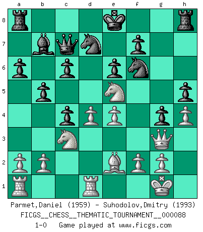 Last move : 1-0 2009 September 26 21:36:27 [Event "FICGS__CHESS__THEMATIC_TOURNAMENT__000088"] [Site "FICGS"] [Date "2009.07.31"] [Round "1"] [White "Parmet,Daniel"] [Black "Suhodolov,Dmitry"] [Result "1-0"] [WhiteElo "1959"] [BlackElo "1993"] 1.d4 d5 2.c4 c6 3.Nc3 Nf6 4.Nf3 e6 5.Bg5 h6 6.Bh4 dxc4 7.e4 g5 8.Bg3 b5 9.Be2 Bb7 10.h4 g4 11.Ne5 h5 12.O-O Nbd7 13.Qd2 Bh6 14.Bf4 Bxf4 15.Qxf4 Qc7 16.Rfd1 a6 17.Qg3 1-0 QGD Slav defense Kingside Castling by player White (move 12) Player White won this chess game. Follow this game move after move (download)Without error there can be no brilliancy. (Emanuel Lasker) Wenn es im Universum noch irgendwo intelligente Lebewesen gibt, dann kennen sie Go. (Emanuel Lasker) El Ajedrez es despiadado: debes de estar preparado para matar gente. (Nigel Short) Des combinaisons [dans le jeu d'échecs] pareilles à des mélodies. Je crois entendre pour ainsi dire la musique des coups... (Vladimir Nabokov) The arrogant army will lose certainly the battle. (Chinese proverb)