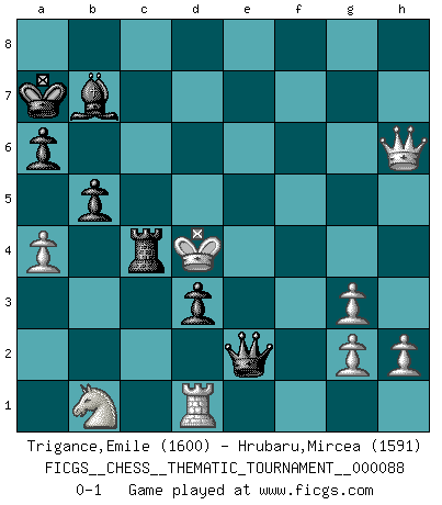 Last move : 0-1 2009 August 31 14:55:50 [Event "FICGS__CHESS__THEMATIC_TOURNAMENT__000088"] [Site "FICGS"] [Date "2009.07.31"] [Round "1"] [White "Trigance,Emile"] [Black "Hrubaru,Mircea"] [Result "0-1"] [WhiteElo "1600"] [BlackElo "1591"] 1.d4 d5 2.c4 c6 3.Nc3 Nf6 4.Nf3 e6 5.Bg5 h6 6.Bh4 dxc4 7.e4 g5 8.Bg3 b5 9.Be2 Bb4 10.Qc2 Nbd7 11.O-O Bb7 12.Rad1 Nh5 13.a3 Nxg3 14.fxg3 Be7 15.Rf2 Qb6 16.b3 cxb3 17.Qxb3 a6 18.e5 c5 19.a4 g4 20.Ne1 cxd4 21.Nb1 Bg5 22.Nd3 Be3 23.Bxg4 Nc5 24.Nxc5 Qxc5 25.Bxe6 Bxf2+ 26.Kxf2 fxe6 27.Qxe6+ Kd8 28.Qf6+ Kc7 29.Qg7+ Kb8 30.Qxh8+ Ka7 31.Qxh6 d3 32.Ke1 Qxe5+ 33.Kd2 Qe2+ 34.Kc3 Rc8+ 35.Kd4 Rc4+ 0-1 QGD Slav defense Kingside Castling by player White (move 11) Player Black won this chess game. Follow this game move after move (download)Those who say they understand Chess, understand nothing. (Robert Hubner) Dass jemand wie Surab Asmaiparaschwili, der selbst Elopunkte gekauft hat , Vize-Präsident der Fide werden konnte, sagt schon einges über den Zustand dieser Organisation aus. (Joel Lautier) Vive, pierde y aprende al observar a tu oponente como gana. (Amber Steenbock) Aidez vos pièces, elles vous aideront. (Paul Morphy) A good programmer is someone who always looks both ways before crossing a one-way street. (Doug Linder)
