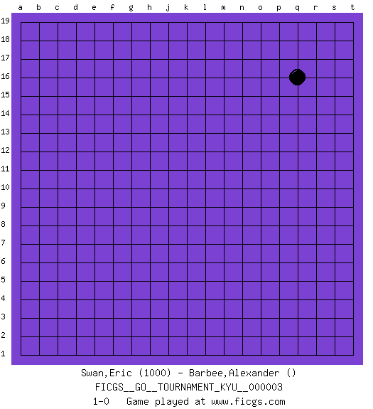 Last move : 1-0 2006 October 21 7:1:6 [Event "FICGS__GO__TOURNAMENT_KYU__000003"] [Site "FICGS"] [Date "2006.09.21"] [Round "1"] [Black "Swan,Eric"] [White "Barbee,Alexander"] [Result "1-0"] [Rating 1 "1000"] 1.q16 1-0 This go game has been lost on time (started : 2006.09.21 4:4:5) Here are the names of the openings (joseki) played in the four corners : Player Black won this Go (weiqi, baduk) game. Follow this game move after move (download)A meijin needs no joseki. (Anonymous) Fame, I have already. Now I need the money. (an elderly Steinitz)