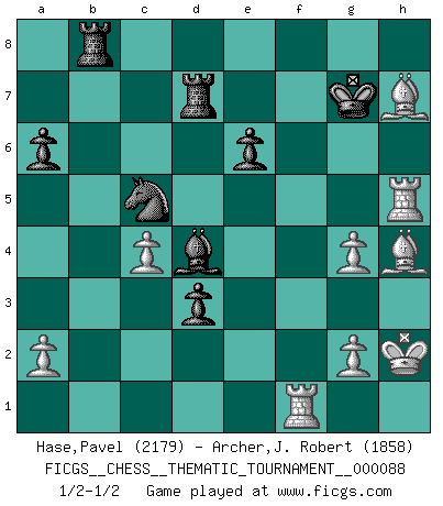 Last move : 1/2-1/2 2010 January 25 23:47:35 [Event "FICGS__CHESS__THEMATIC_TOURNAMENT__000088"] [Site "FICGS"] [Date "2009.07.31"] [Round "1"] [White "Hase,Pavel"] [Black "Archer,J. Robert"] [Result "1/2-1/2"] [WhiteElo "2179"] [BlackElo "1858"] 1.d4 d5 2.c4 c6 3.Nc3 Nf6 4.Nf3 e6 5.Bg5 h6 6.Bh4 dxc4 7.e4 g5 8.Bg3 b5 9.Be2 Bb7 10.h4 g4 11.Ne5 h5 12.O-O Nbd7 13.Qc2 Nxe5 14.Bxe5 Bg7 15.Rad1 O-O 16.Bg3 Nd7 17.e5 f5 18.exf6 Qxf6 19.Bd6 Rf7 20.b3 Rc8 21.bxc4 c5 22.Nxb5 a6 23.Nc3 cxd4 24.Ne4 Qxh4 25.Bg3 Bxe4 26.Qxe4 Qf6 27.Bd3 Bh6 28.Rfe1 Nc5 29.Qg6+ Qxg6 30.Bxg6 Rg7 31.Bb1 Rd7 32.Re5 Bg7 33.Rxh5 Na4 34.Bh7+ Kf7 35.Rf1 d3 36.f3 Bd4+ 37.Kh2 Nc5 38.fxg4 Kg7 39.Bh4 Rb8 1/2-1/2 QGD Slav defense Kingside Castling by player White (move 12) Kingside Castling by player Black (move 15) This chess game ended in a draw. Follow this game move after move (download)A thorough understanding of the typical mating continuations makes the most complicated sacrificial combinations leading up to them not only not difficult, but almost a matter of course. (Siegbert Tarrasch) Die westlichen Werte sind eine Sprache, welche die Putin-Administration nicht versteht. (Garry Kasparov) El Ajedrez se juega con la mente... ¡no con las manos!. (Renaud y Kahn) On peut tirer plus d'utilité d'une partie perdue que de 100 parties gagnées. (Capablanca) Mandala - that's it! 16x16 squares as multiple of the four and the eight because of the Four Noble Truths and the Noble Eightfold Path. (Heinz-Georg Lehnhoff about Big Chess)